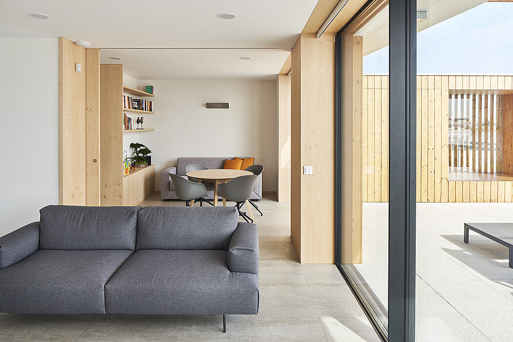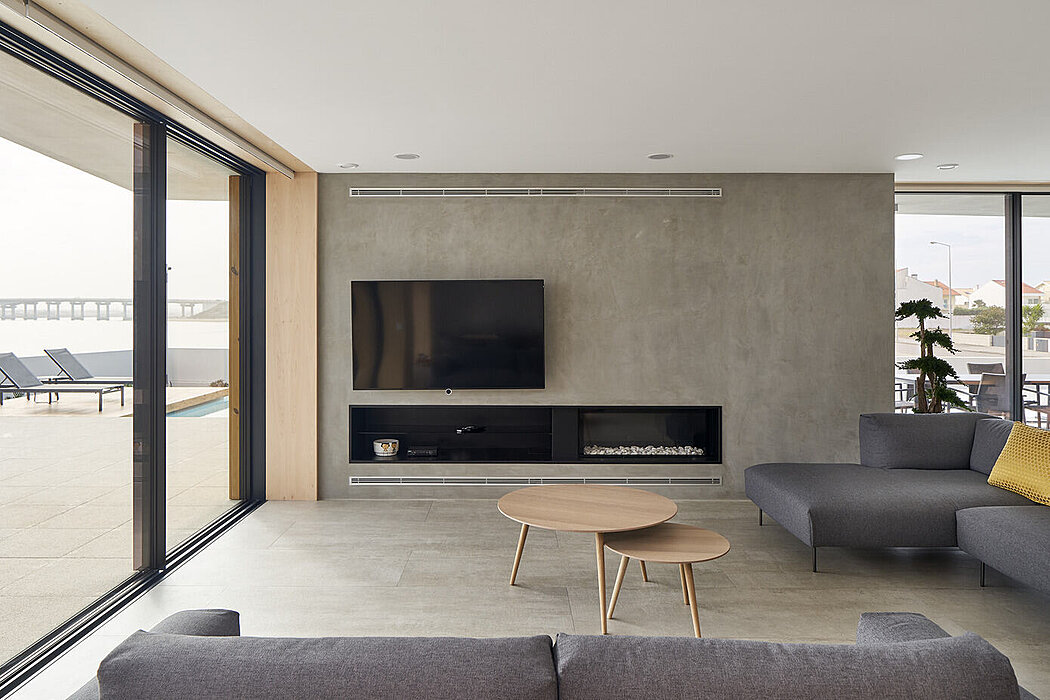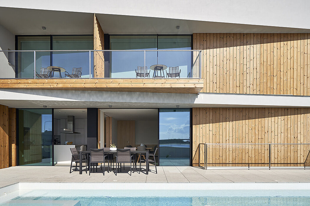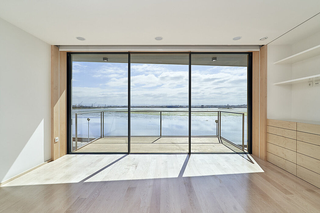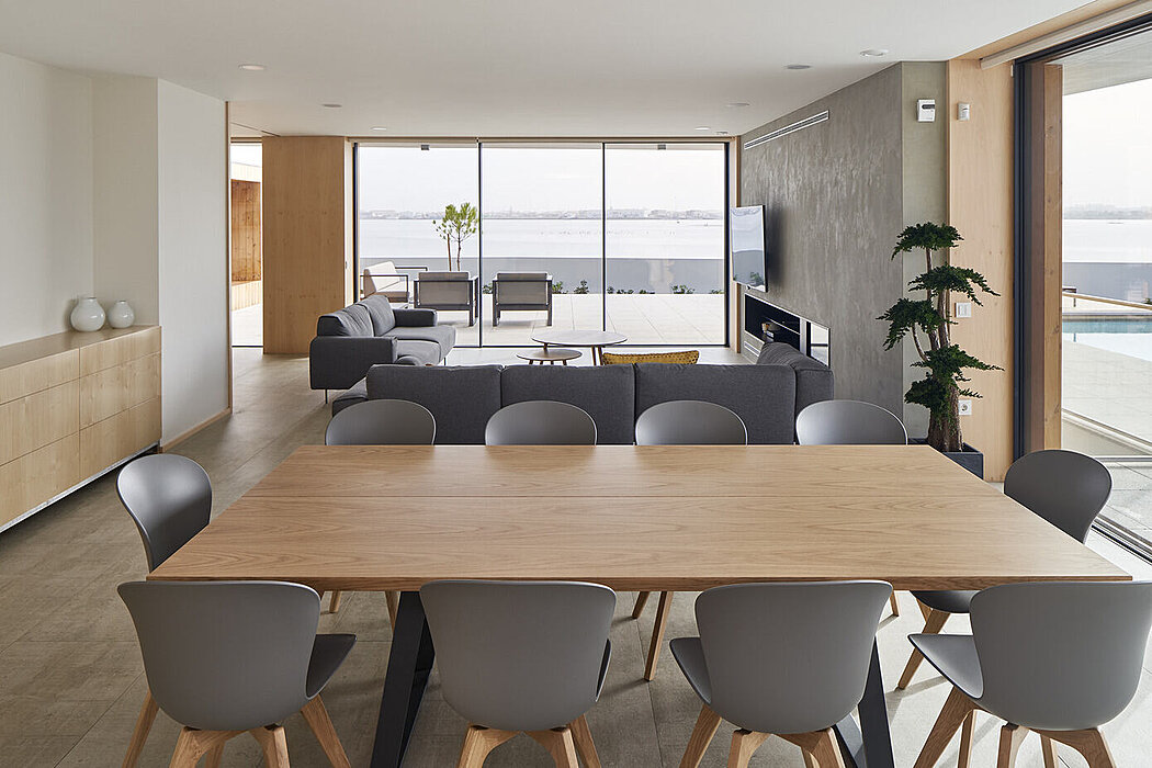 On the ground floor are located all the social areas, connected and looking out to the outdoor patios. The south patio features a pool and the east patio overlooks the dynamic Ria landscape. The kitchen opens to the living and dining room through two large sliding doors and there is also a bathroom and a multipurpose space that allows the living room to be extended.