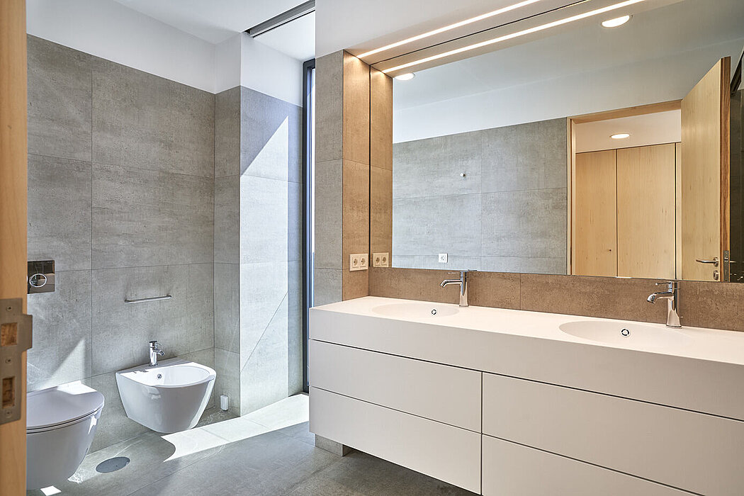 The house arises as a compact volume dematerialized by the oblique slabs and balconies. The coating materials such as apparent concrete, wood, and white plaster contribute to the differentiation of levels, making the whole more dynamic and less compact.