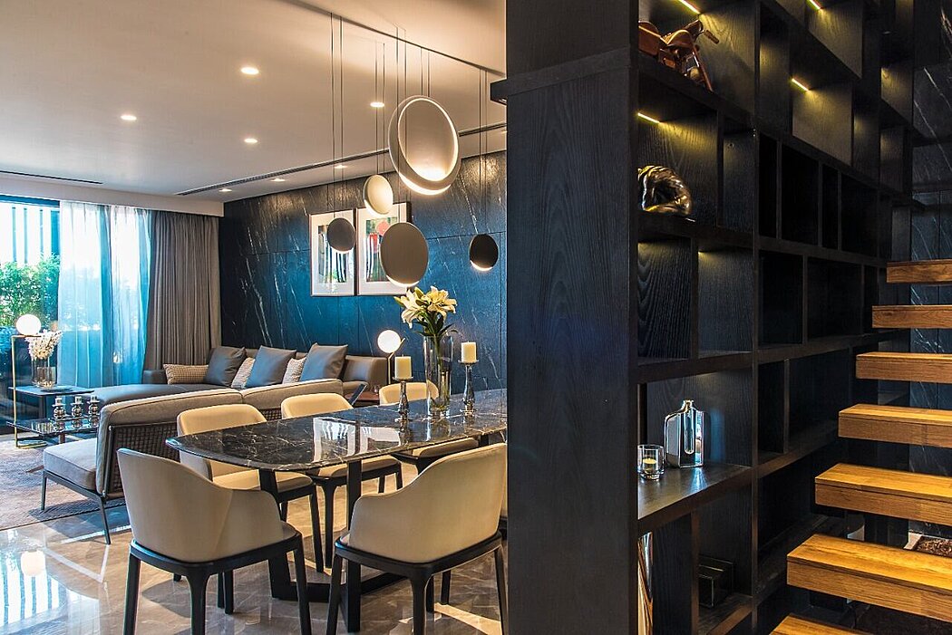 The use of double-heighted spaces is a design strategy adopted throughout the house to enhance both the functional and aesthetic potential of the structure. Automation in the HVAC system ties all components together so that everyone can benefit. The outdoor spaces of the house and its open terrace feature a misting system that helps reduce the surrounding temperature by almost 5 degrees, offering an ambient atmosphere even during the hot summer months.