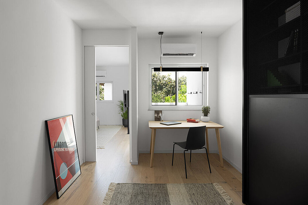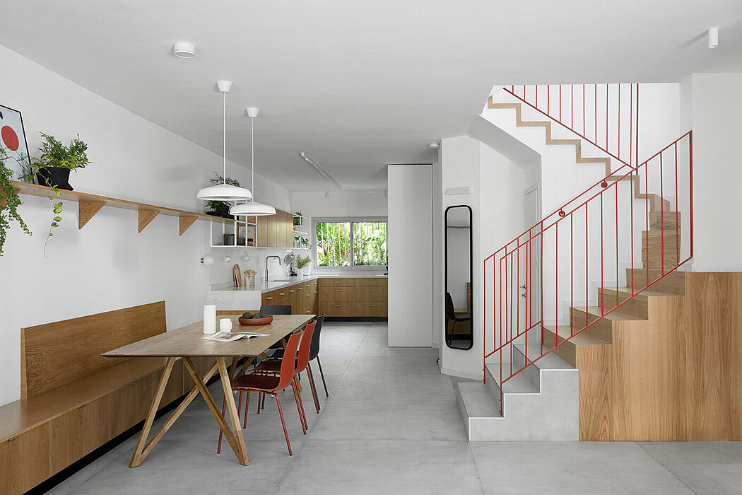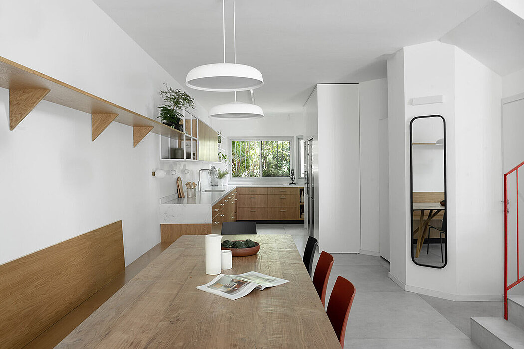 This private residence was renovated to meet the needs of a family of six and features a unified and modern space with a fifteen-meter-long windowless wall that was transformed into an advantage. The new layout includes an open space kitchen-dining-living with one continuous detailed element, changing its function accordingly. The second floor features the private area with a bright and spacious home office overlooking an inner patio. Tel Aviv is known for its Bauhaus architecture and TA House is a testament to this style.