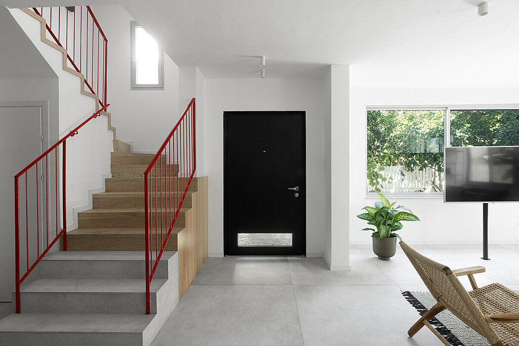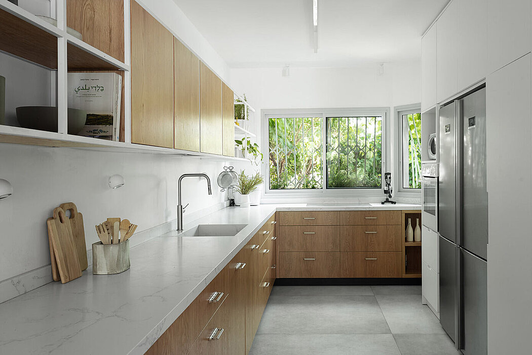 This private residence located in a small town in the Tel Aviv district of Israel underwent a complete renovation custom made for a family of six. The original layout had a small kitchen that didn’t meet family needs, a lack of storage solutions causing constant mess, and a garden disconnected from the living room with no comfortable access. The main challenge was a fifteen-meter (49.2 ft) windowless wall that ran from one side of the space to the other, where functions were placed incoherently, making the space feel long and narrow.