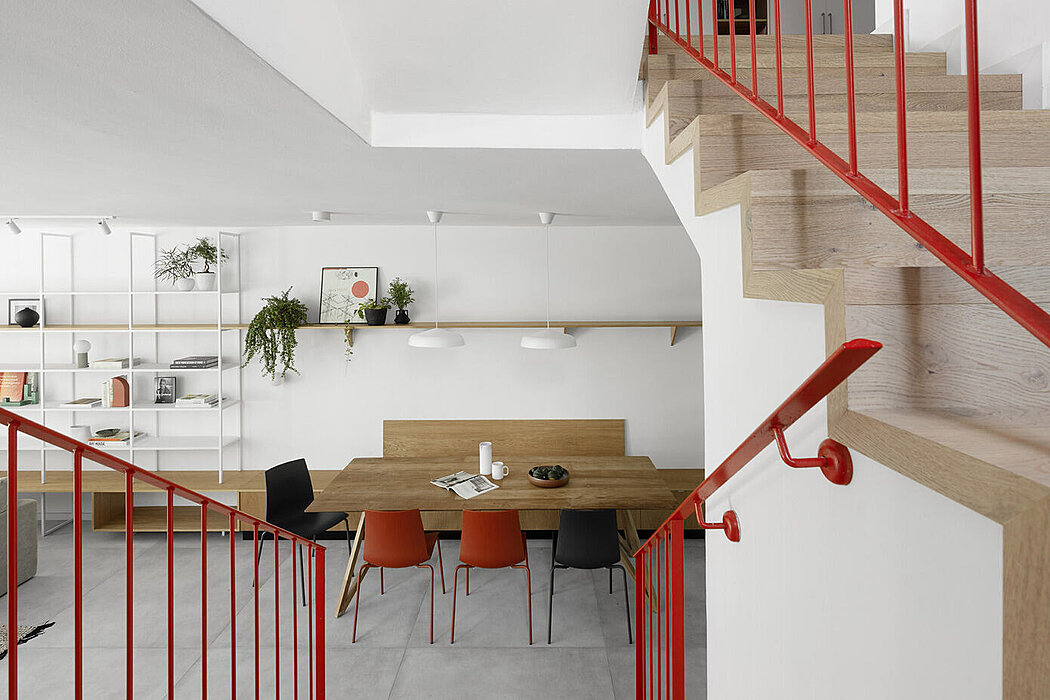 The new layout is an open space kitchen-dining-living with one continuous detailed element, changing its function accordingly. Made of wood and steel, it defines each area separately and at the same time unifies the space with a clear design language. The kitchen has lots of storage and a long worktop suited for family cooking and entertaining. The worktop wraps the side of the kitchen and creates an interesting mixture of materials, and with a diagonal transition becomes the dining space area, with a bench seating for family eating and get togethers. Additional storage drawers are under the bench. Above is a single wooden shelf leading from the kitchen all the way to the other end of the library and it is this shelf that connects this whole element together visually. The bench then becomes a white steel library defining the living room space.