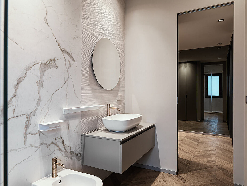 Miserendino paid meticulous attention to the specific materials used in the project: wood, glass, metal, and stone. Spaces with strong personalities follow a dress code of sinuous elegance, with few calibrated presences. The apartment is embellished with warm, soft, and reassuring lights and decorated with designer pieces and custom-made furniture.
