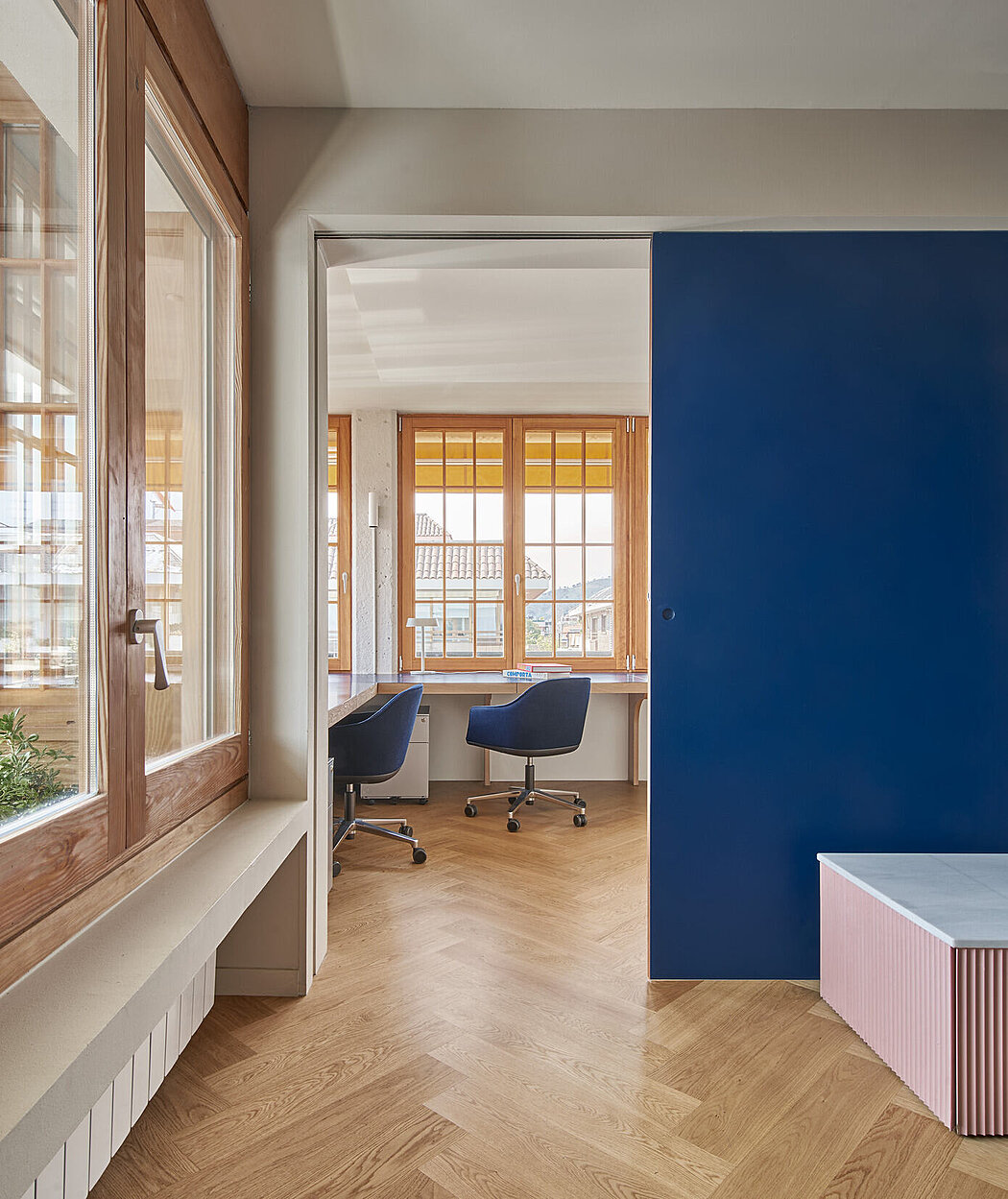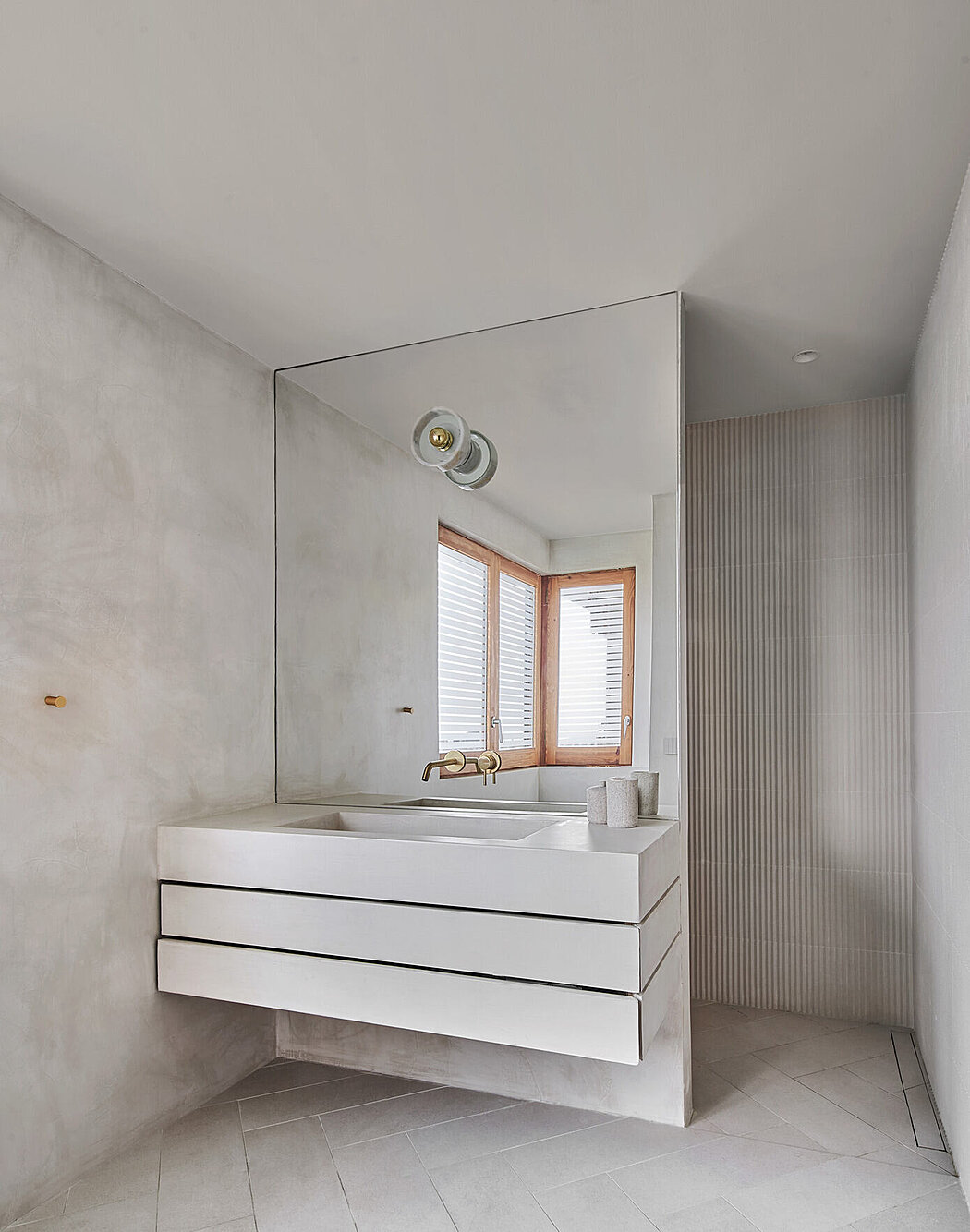 All private rooms, all en-suite, are grouped along the perimeter, surrounding the open day area. All furniture–closets, low tables, working desks, and extra-large beds–has been custom designed and fitted along the walls, creating a strong feeling of spaciousness.