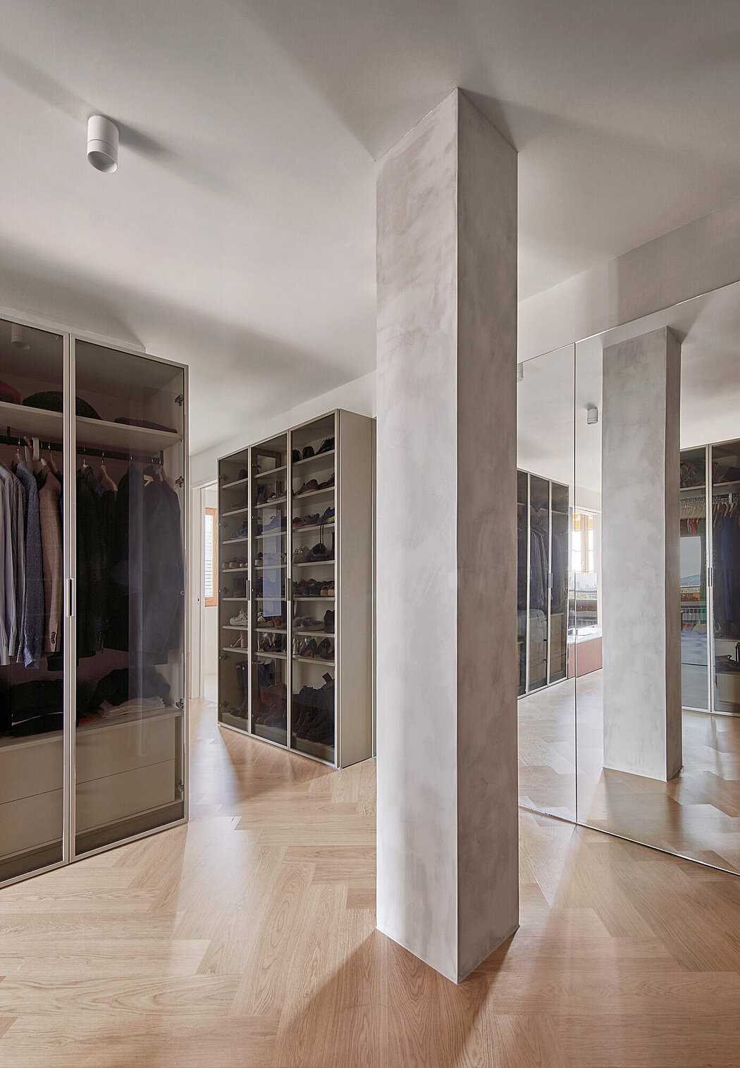 The master bedroom features a unique open plan, structured with detached wardrobes and sliding partitions. Large floor-to-ceiling mirrors, combined with reflective smoked glass doors, create a geometric mirage in the walk-through closet. A warm palette of dusty tones, with splashes of bright, bold colors, is replicated throughout the apartment. Wooden window frames, oak and teak paviments, marble and granite countertops, and ceramic coverings complete the look.
