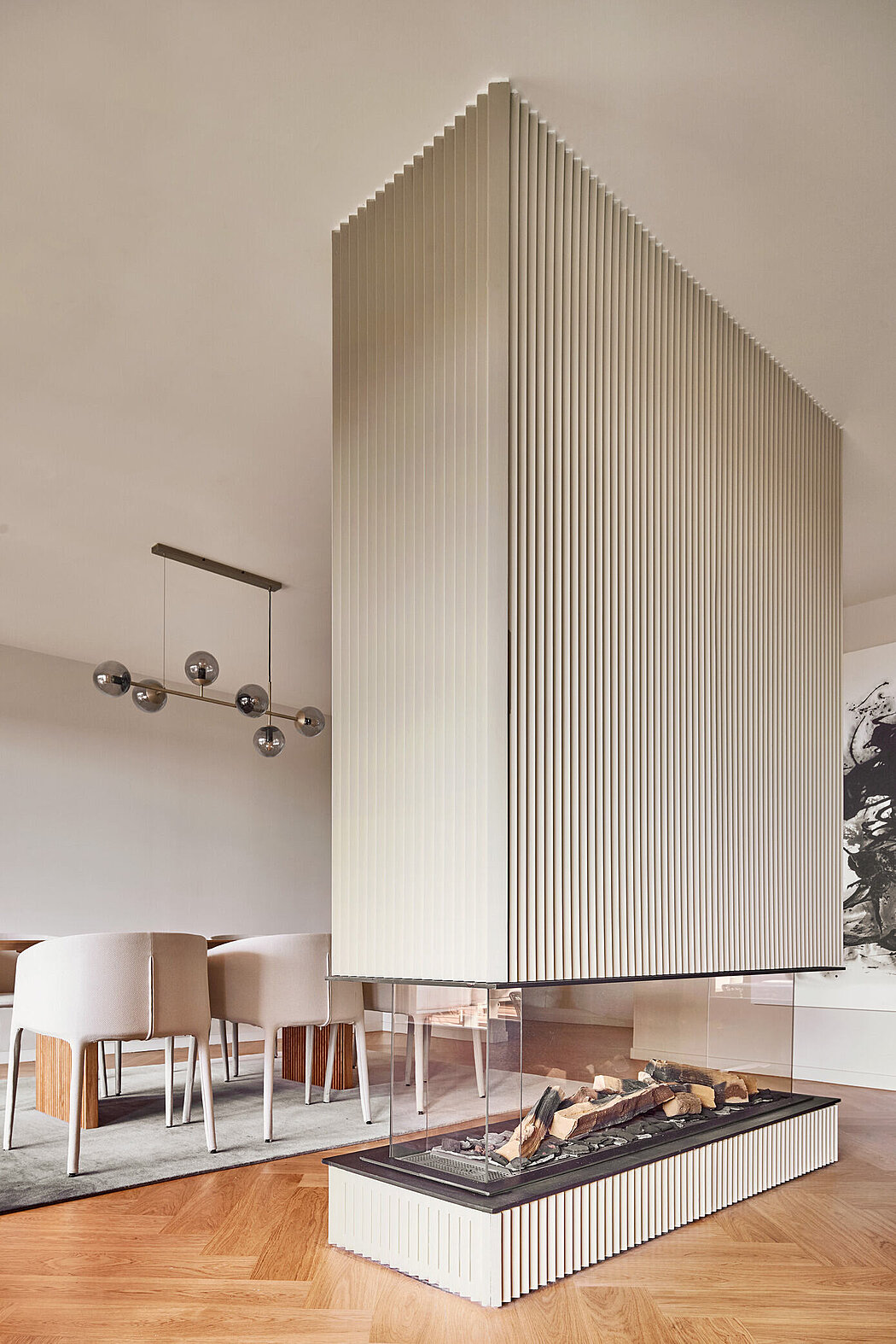 Custom designed pivot elements help to organize the open plan into different settings. Highlights include: a granite high bar countertop (3.3 ft), three extra-large marble center tables (6.5 ft), and a hovering fireplace. Each of these components is a strong monolithic element, encouraging a floating circulation around it. The strength of these elements was so great that the façade was unmounted to allow for the installation of a one-piece 180 cm (5.9 ft) diameter marble table.
