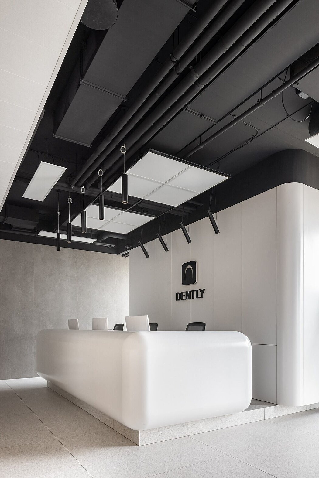 Designed by the renowned architect Zaha Hadid, DENTLY is a new dental clinic located in the SKY PARK project. Covering almost the entire floor of one of the towers, the clinic features a reception desk, a small meeting room/office, and a generous waiting area designed to provide a calming atmosphere. To help clients relax, an aquarium, plants, and a TV were added to the space.