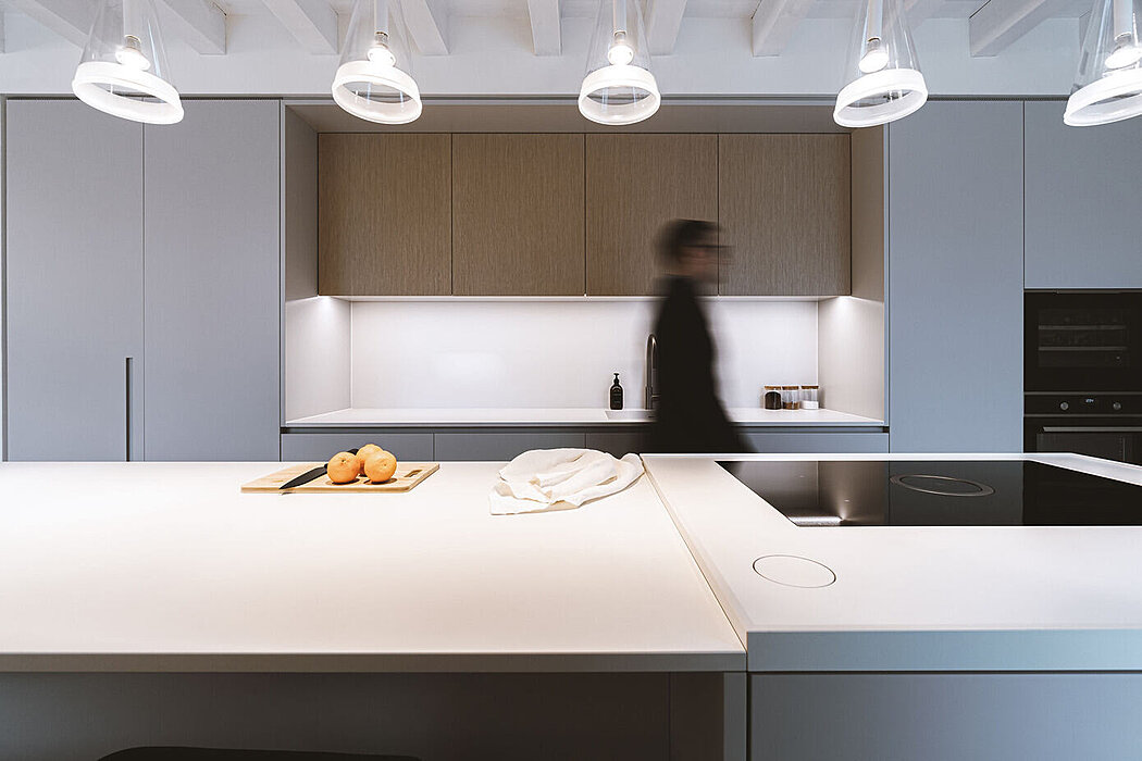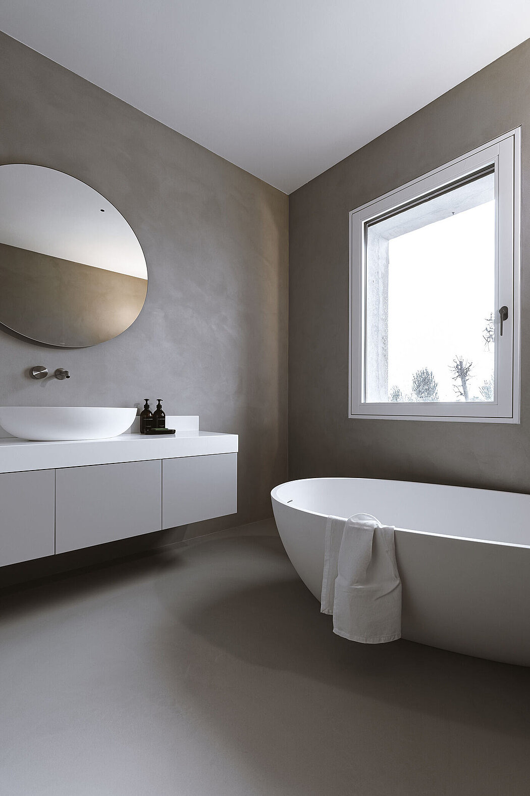 Parquet floors combined with architectural concrete are used throughout the space. Flush doors were made to measure, and the lighting emphasizes the architectural elements with iconic pieces. Lacquered wood furniture, Corian bathroom countertops, and sinks, and a Dekton kitchen top and back complete the look. This blend of materials achieves a dynamic and layered effect while maintaining the traditional essence of the farmhouse.