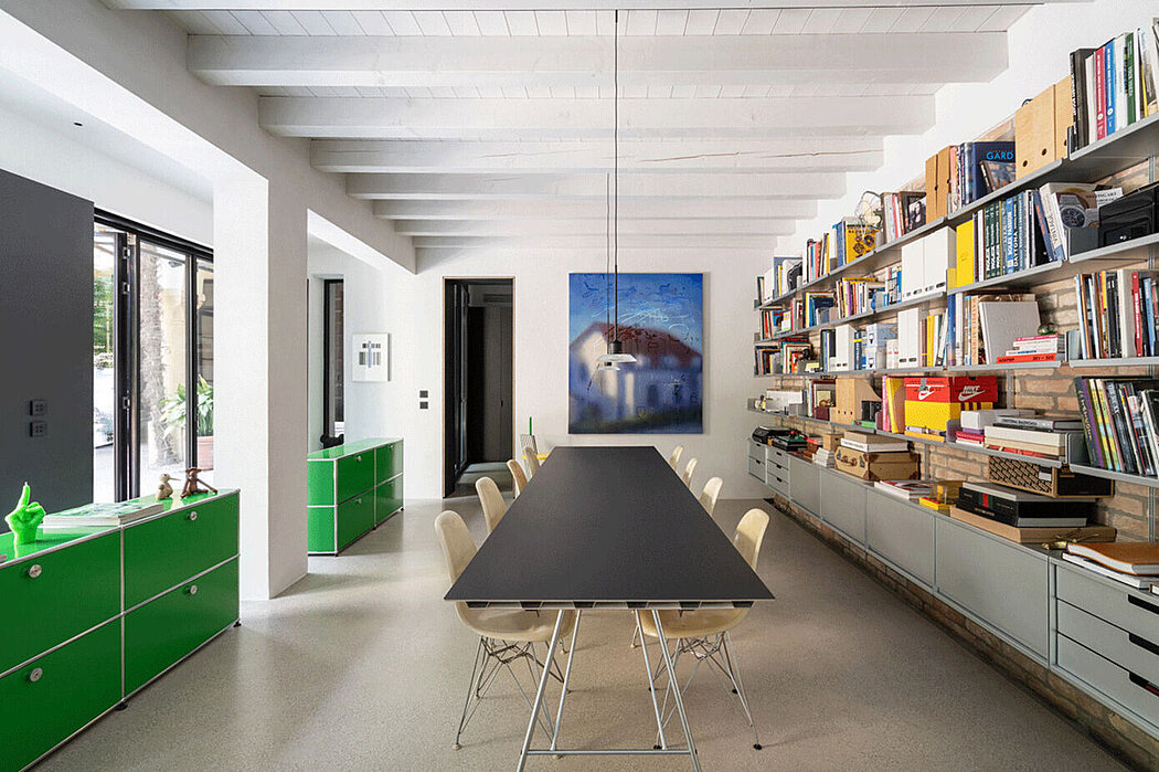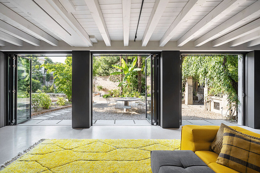 Large opening windows directly connect the living room to the garden and the studio to the courtyard. The black iron profiles of the window frames complement the dark linoleum interior pilasters. The kitchen is developed on the upper floor and extends into a bioclimatic glazed greenhouse and a generous terrace. All relational places expand toward the outdoor space, incorporating vegetation.