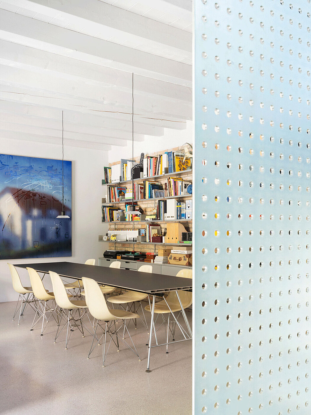 The living area is composed of autonomous parts that create a fluid sequence in which domestic life meets the work of the owner, an eyewear designer. The interior rooms are separated by sliding partitions, and the spot lights generate similar light effects.