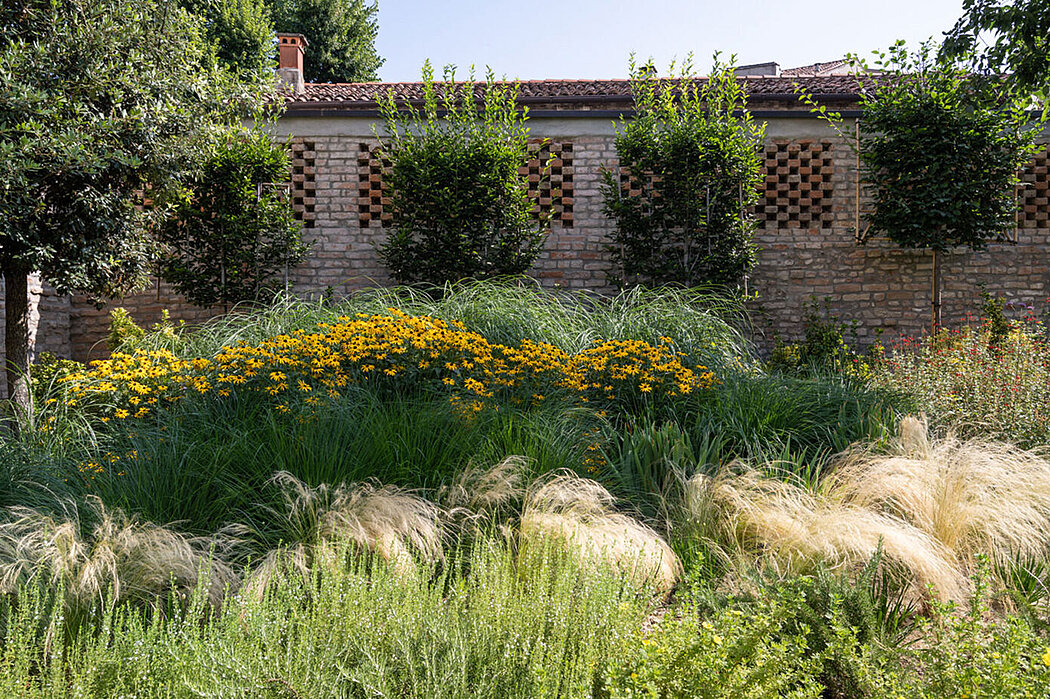 The garden is redesigned by recovering the memory of the ancient brolo and the site of the stables. Old plants are moved to the eastern end and supplemented with new specimens of hackberry, ash, osmanthus, and dogwood. Along the perimeter, a band of espaliered holm oaks and hornbeams are planted against the backdrop of the boundary wall. Trachyte masegne (2.5 cm) are recovered in the paths of the ancient broli, where perennial grasses are planted. The site of the stables is recognizable by the use of face brick in the profile of the ancient front and the paving. Arranged in shear, the brick distinguishes resting spaces and borders of planted or mineral bands.
