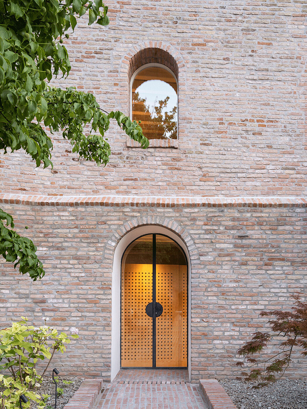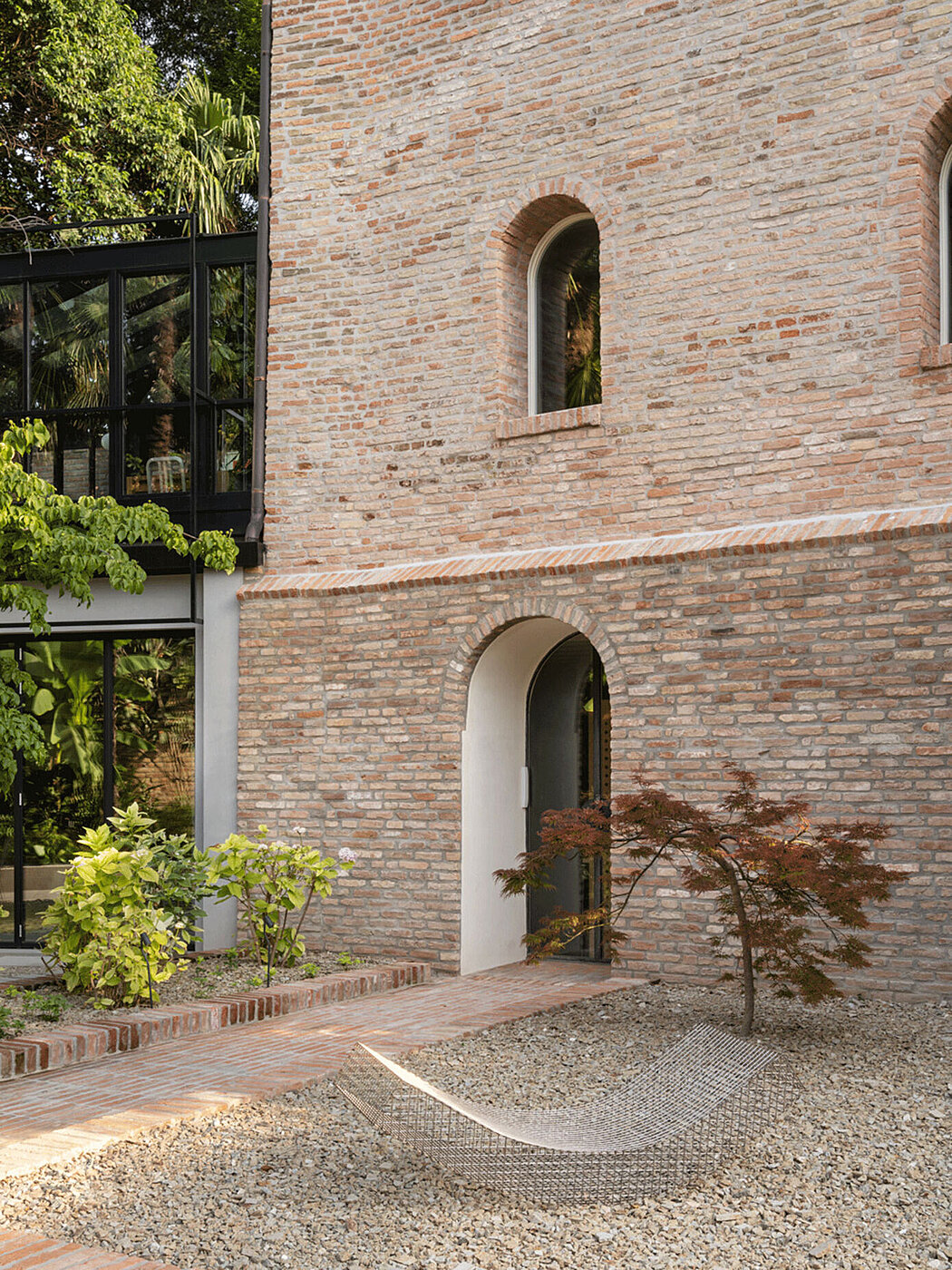 Inside the house, the living space is composed of autonomous parts that form a fluid sequence, where domestic life meets the work of the owner. The garden is redesigned by recovering the memory of the ancient brolo and the site of the stables. The brick face of the boundary wall is repeated with continuity inside the building, creating a unique and romantic atmosphere.