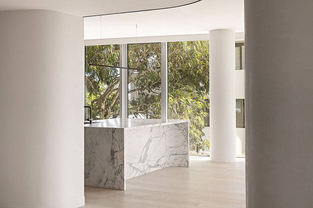 Each of the residences is unique with different access to light, sightlines, and terraces. Planting, park and city views beyond are framed by the expanse of glazing and horizontal planes. Softened with the use of curving volumes and plaster, the interior surfaces are complemented by highly crafted joinery in natural timber and book-matched marble, adding to the overall feeling of warmth, contrast, and pared-down luxury. The bathrooms are wrapped in a travertine mosaic providing a subtle textural quality to the space and contrasting with the solid vanity unit of stained timber and stone.