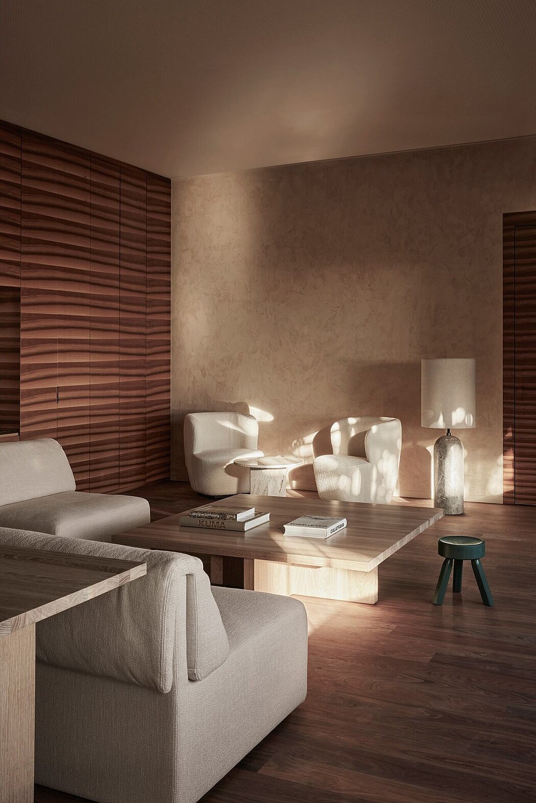 Lighting has been handpicked for its sculptural qualities, including mobile chandeliers by Michael Anastassiades that add drama to the main dining room, an Ingo Maurer Pendant in the reception area and a Mathieu Matégot sculptural wall light by Gubi in the restaurant bar. For the lounges at the lower level, Space Copenhagen has used their Wonder Sofas and Stay Chairs designed for Gubi in both fabric and leather variants and lighting from Gubi’s Gravity Collection. Classic Swiss furniture from the iconic manufacturer DeSede is used alongside the Space Copenhagen Loafer Chairs by &Tradition. In the breakfast area, the Mater dining Chair by Space Copenhagen was used together with a colored rattan chair from Bonacina 1889.