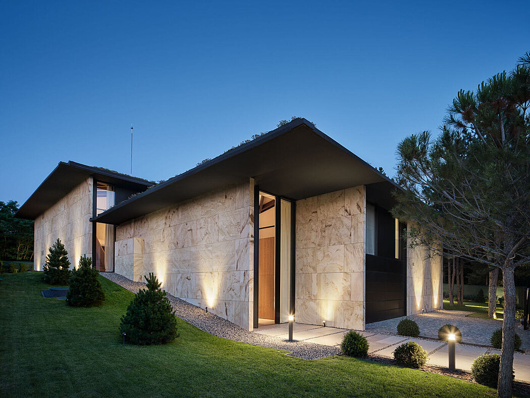 This 2022 designed house, with its majestic green roof, blends naturally into its surroundings, while the wooden skeleton of the roof and oversized lamp dominate the interior spaces. The L-shaped structure is open to the park, with large-scale glazing, and closed to the street and town with a series of stone-clad and solid masonry planes, leaving only narrow gaps and the double-height entrance door.