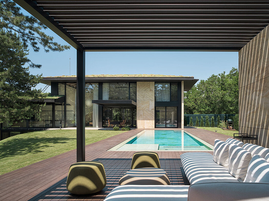 The wooden skeleton of the roof and a giant lamp dominate the interior spaces. The green roof softens the rigid lines of the house and seamlessly melds it with its natural surroundings.