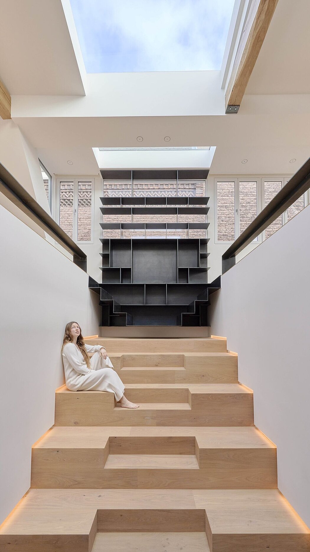 The home is structured in two floors connected by a prominent amphitheater facing a steel library and the skylight. This central piece is not just a physical connector but almost a piece of furniture, perfect for watching a movie, brainstorming, or enjoying a live concert on the stage in front of the stairs. This little volume contains a Japanese tree.