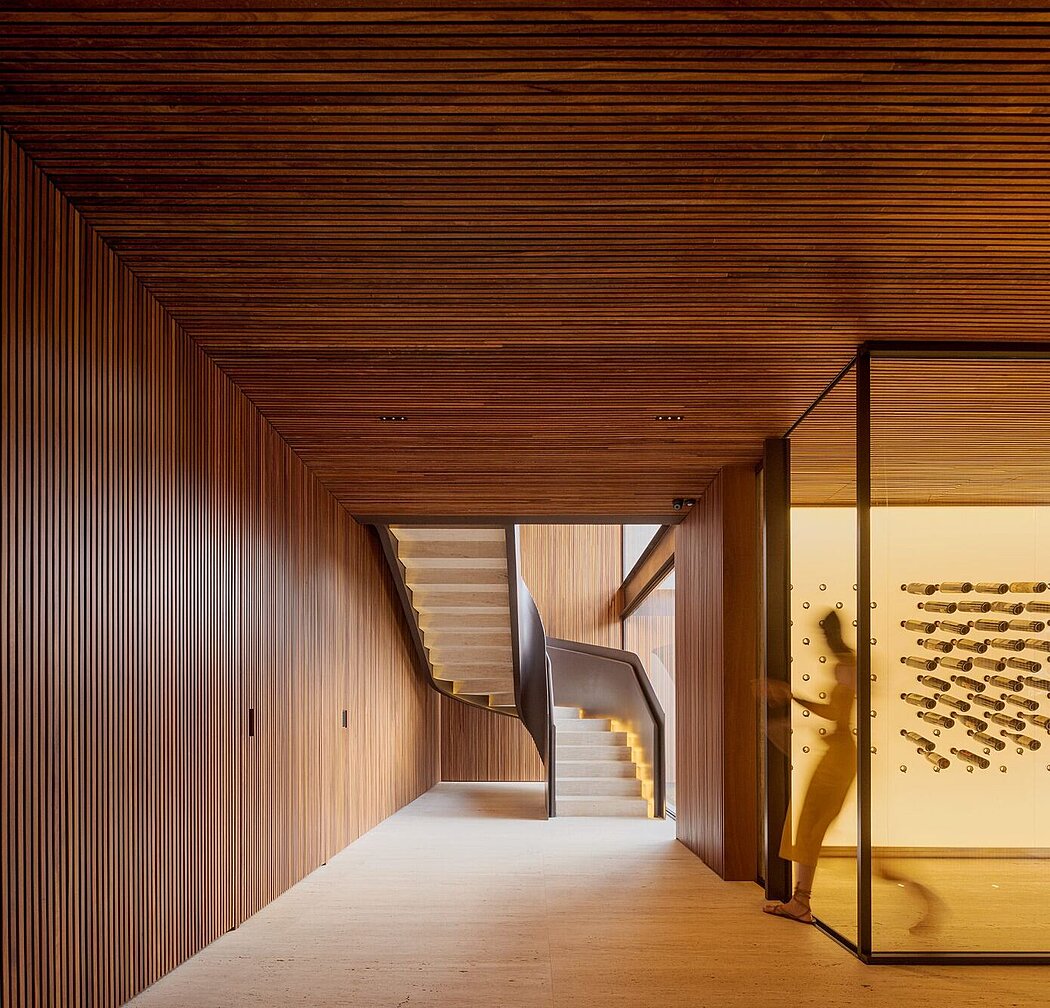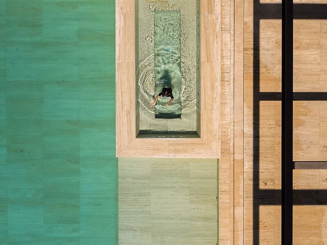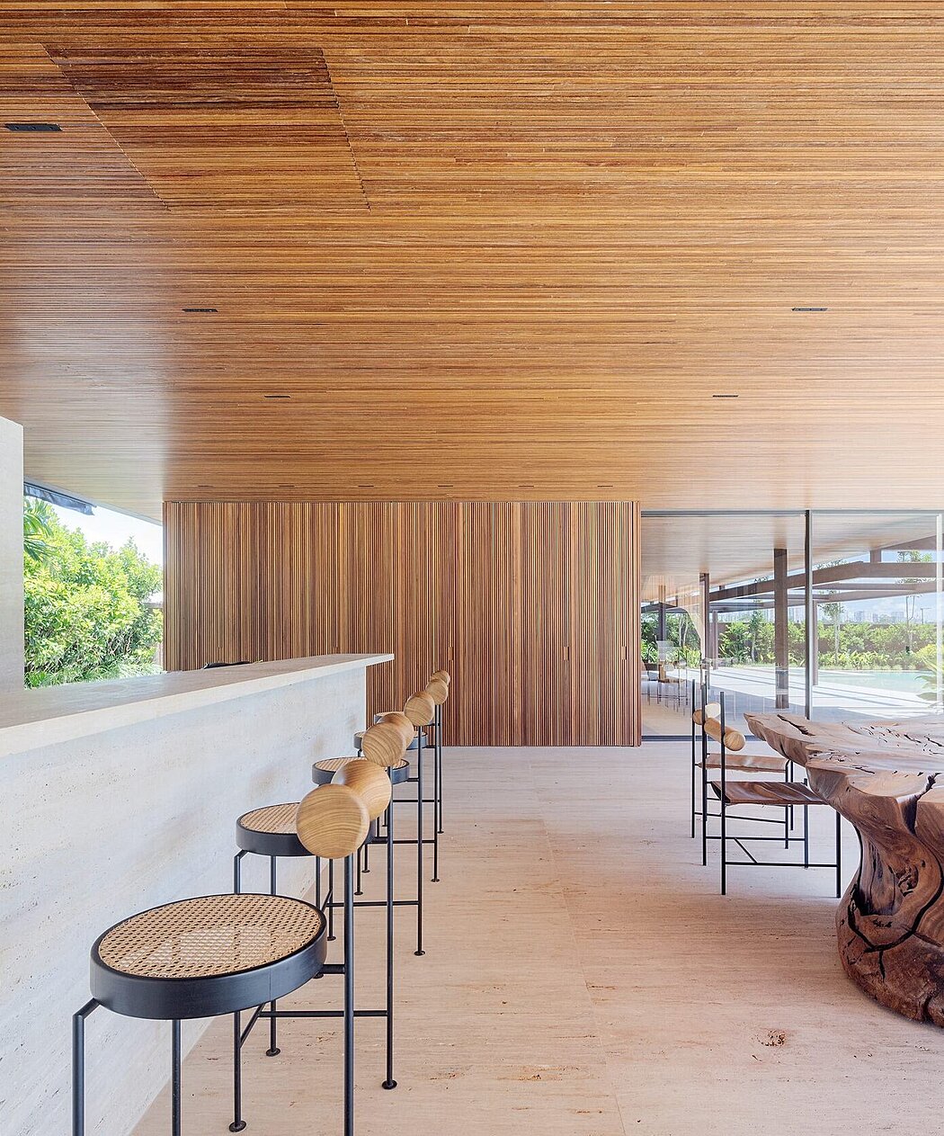 The program centers around the needs of a family, with special consideration for the children. The toy library is connected to the living area, and there is also a gym area, two home theaters, one connected to the living room and the other on the upper floor. The master suite faces a conservation area, and the other bedrooms overlook the pool. Nature is an ever-present element in the project, from the structure’s rips for the garden to the landscape views.