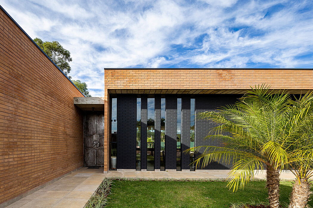 Spatial and visual integration is a crucial aspect of the MP Residence concept. The living room and gourmet area are connected by a large glass panel that provides a complete view of the pool and garden, creating a vast meeting space. The facade of the residence has small vertical openings, contributing to privacy and filtering sunlight. Black painting on the bricks adds depth and an industrial atmosphere, which was one of the clients’ requests.
