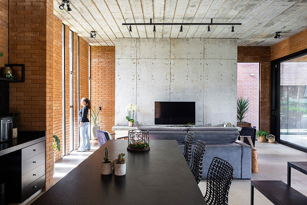The decision to use ecological brick as the main structural and aesthetic element of the house was a conscious one. Exposed concrete is present throughout the house, including the floor, panel slab, and blind gable which serves as a structural element and a piece of furniture for the television. The porch lining is made of wood, and ceramics and fulget are used on the external floor around the pool.