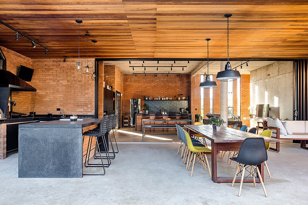 MP House is an ecologically correct and intelligent brick house located in the residential condominium of Cabreúva, Sao Paulo, Brazil. Designed by Taguá Arquitetura e Design in 2021, it has 350 m² (3800 ft²) of built area and has industrial design style with exposed concrete, steel and wood elements.