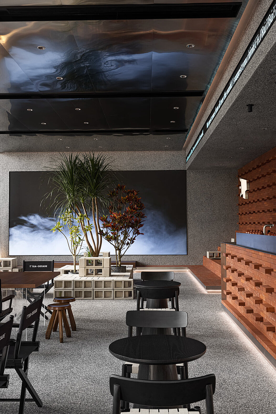 T’TEA uses washed stones, stainless steel, and red bricks to create a light, elegant, and appropriate space, imitating the realm of comfort and wonder, and the ritual sense of life. The advanced intelligent light control and curtain control system takes care of everyone’s emotions, and the indoor color temperature changes quietly with the tide of time. The BOSE surround background music complements the 6x3m ultra-large P2.0 full-color high-definition LED screen, forming an excellent spatial echo.