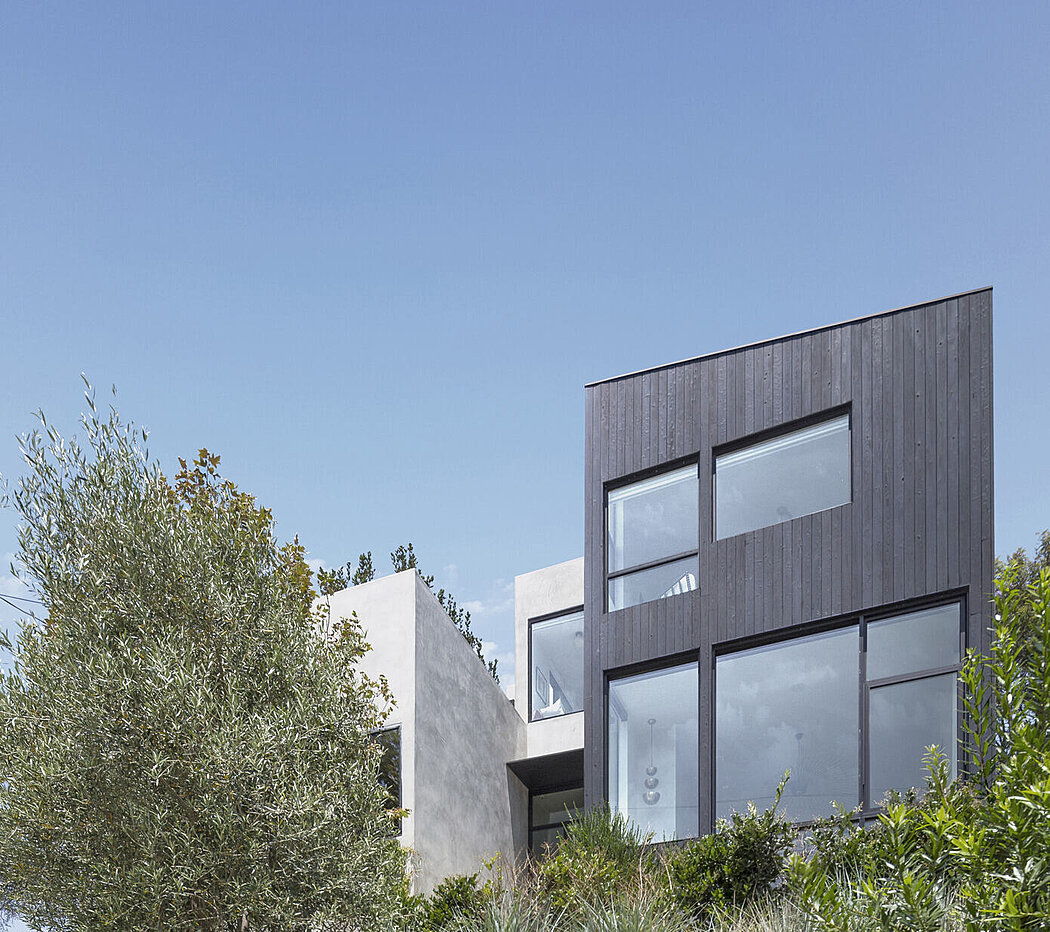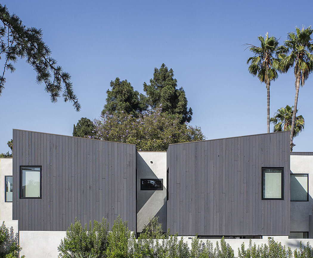 The pavilions feature Shou Sugi Ban charred cypress wood cladding, while the circulation spine showcases a smooth exterior plaster finish. The interior materials include rift-sawn oak floors and cabinets, dark bronze aluminum windows and railings, cement tile, and plaster. The gardens and surrounding landscape consist of native plants and trees, primarily irrigated through onsite rainwater catch basins. The integration of gardens and numerous operable window systems enables effective passive heating and cooling throughout the year.