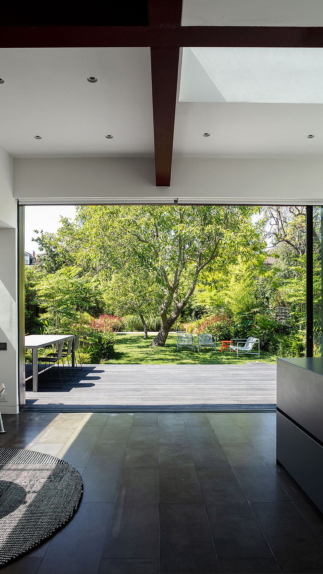 The extended volumes’ forms, with the lower section nearest the boundary and the higher adjacent to it, result from applying the Permitted Development rules. Vertical and horizontal structural members further emphasize this transition between the two volumes.