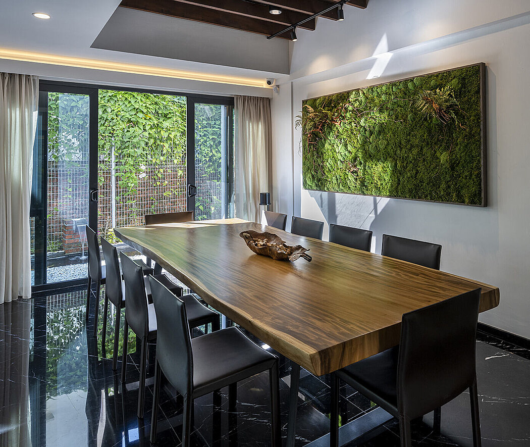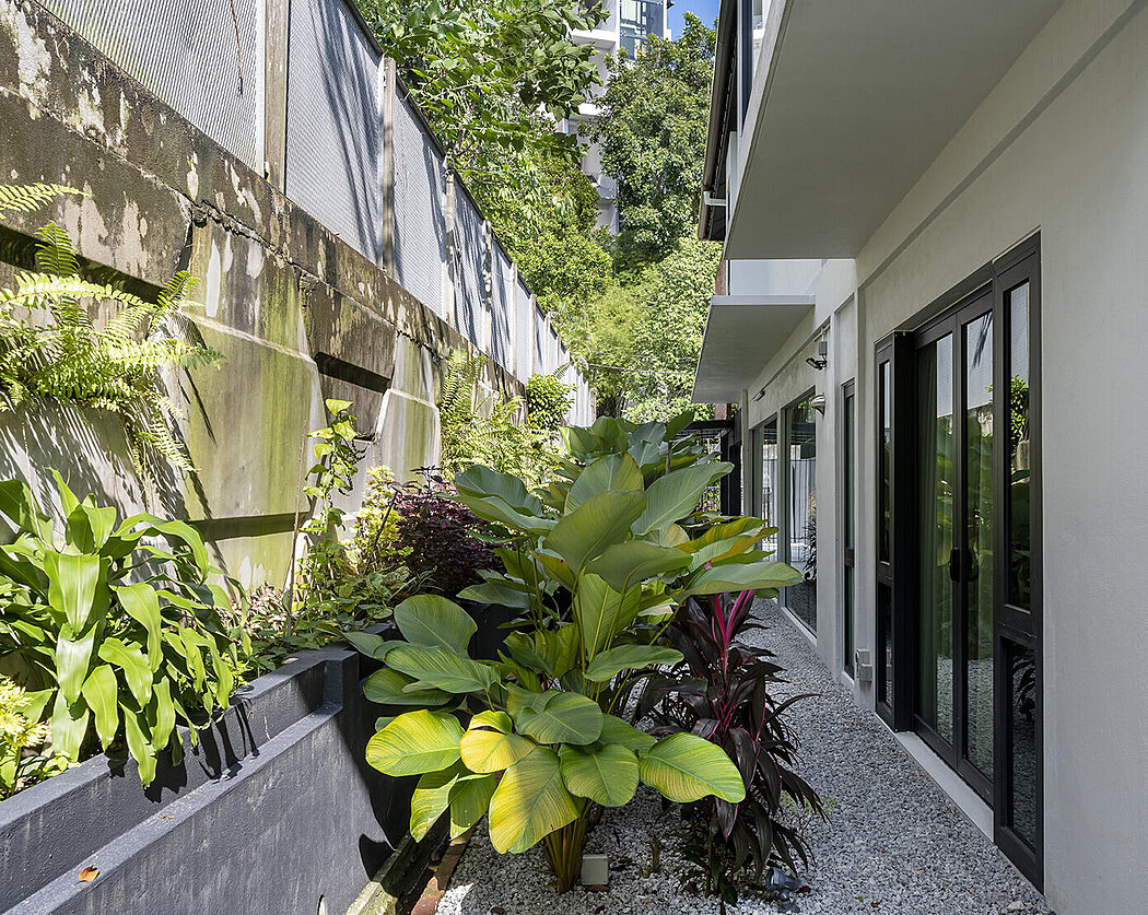 The original two-story bungalow featured a small, simple rectangular plan, with a combination of RC slab flooring and timber joists and floorboards in certain upper floor areas. This allowed for a clean, modern intervention into the old structure while maintaining an industrial vibe. One long side of the house features a 6-meter (19.7 feet) high retaining wall, providing privacy and the opportunity to create a vibrant, colorful garden that integrates with the interior living spaces.