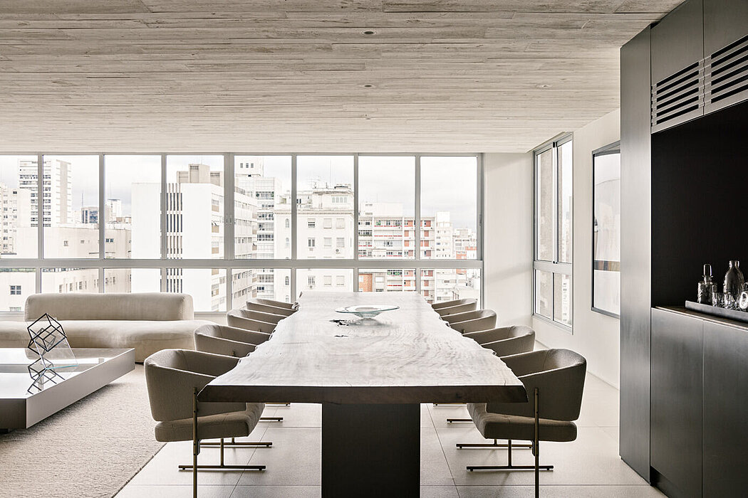 The interior features furniture designed by renowned designers, such as the Anette armchair and Senior dining chairs by Jorge Zalszupin; the Adobe 2 table by Guilherme Wentz; a lamp by Sergio Rodrigues; and a side table by Lucas Recchia. Additionally, several pieces were designed by Arthur Casas, including the Ettore side table, the Disco stool, and the log dining/work table.