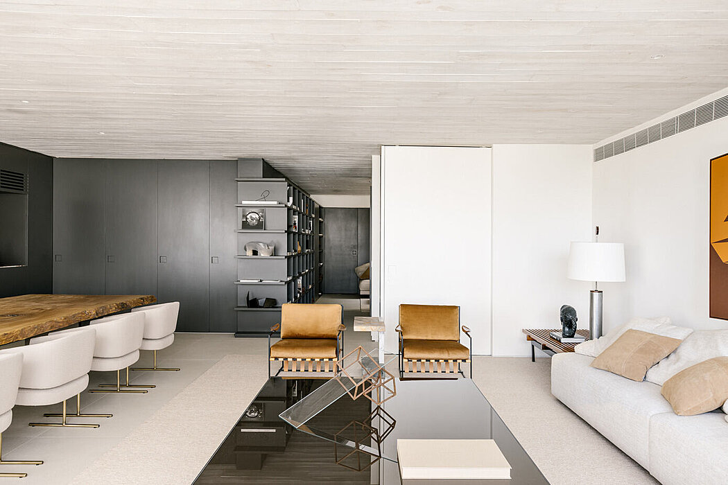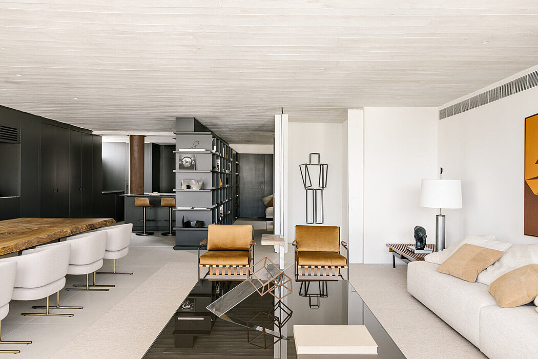 This apartment’s design skillfully combines spaces, fostering conversation between social areas while adhering to the clients’ request for a specific aesthetic inspired by New York lofts.