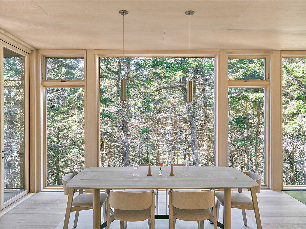 The dense evergreen forest can feel dark at times, so we wrapped the interior spaces in birch to create a warm and light ambiance. Unified wood tones in the cabinets, flooring, and furniture maintain a tranquil interior palette, despite the woodgrain’s motion, and allow the textures of the forest views to take center stage. A wall of folding doors opens the main living spaces to the screen porch to the south, reinforcing the cabin’s strong connection to the forest.