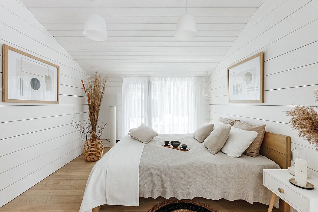 The master bedroom features a large bed, storage area, dressing room between the bedroom and bathroom, and a separate bathroom for the owners. We prioritized eco-friendliness and functionality in every aspect. All furniture is produced from wood at the same factory. Large windows flood the room with light, and wide window sills serve as a place for cosmetics, flowers, or decorative items. The dressing room area can accommodate closets, a small private lounge area, or even an office.
