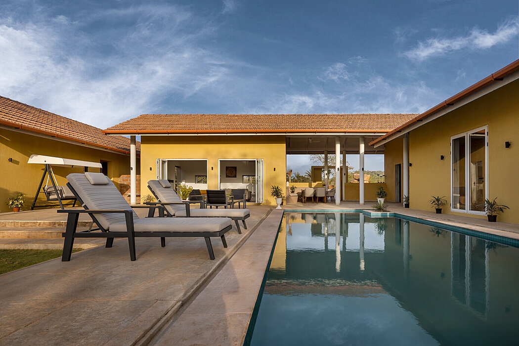 Perched 1200 ft (365.76 m) above sea level, with the majestic Western Ghats as its backdrop, the Sienna House uses a unique blend of simple geometry and open spaces, enveloped by warm, muted walls and Mangalore tiles, to provide an intimate sanctuary for a family seeking tranquility. This stunning creation pioneers the architectural character of the burgeoning Serenity Villas and Farms development, while setting an unprecedented example of sustainable design that beautifully celebrates its natural surroundings.