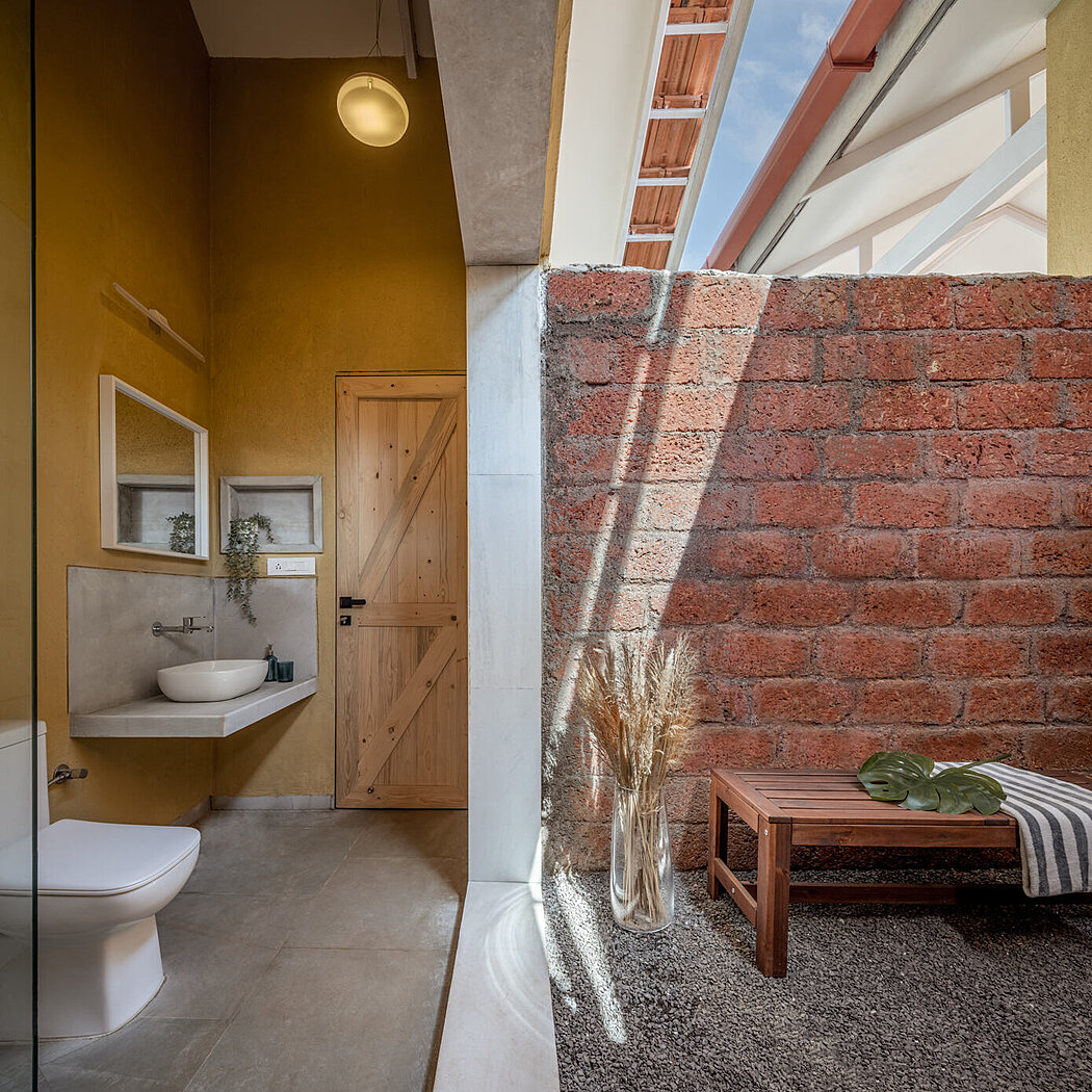 Inside, earthy colors and textures fill the rooms with warmth. Clutter-free living spaces and bedrooms emphasize the biophilic design elements, nurturing a bond with nature. The minimal, English-style furniture, made of natural pinewood, adds a touch of classic elegance. Generously-sized north-facing windows and high ceilings allow ample natural light while promoting cross-ventilation. Each bathroom extends into a semi-open alley, offering a refreshing, unique experience.
