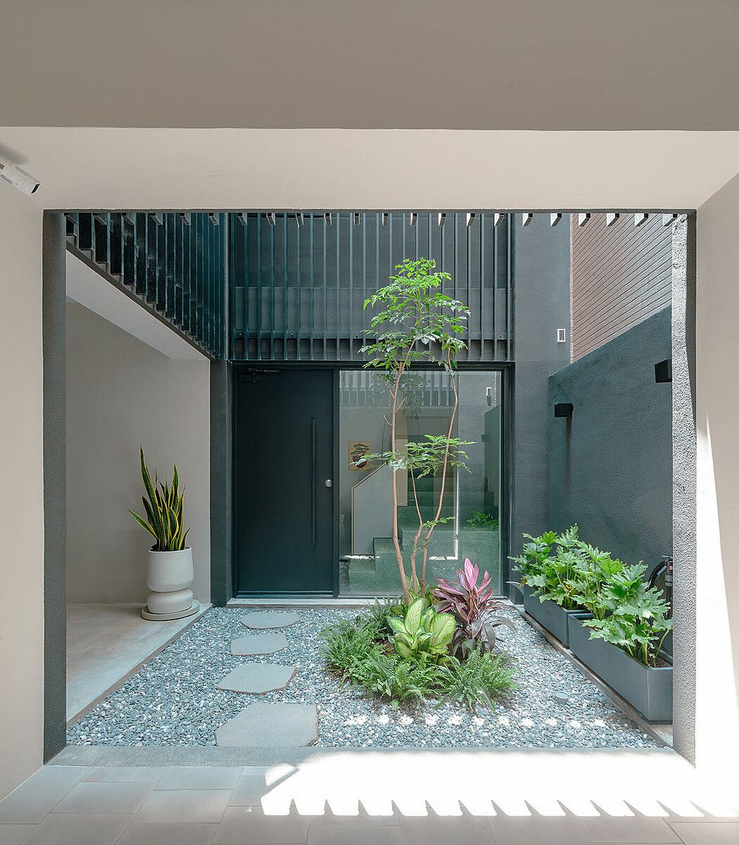 The entryway, guarded by an interior garden, artfully eases the transition from bustling city streets to the serene heart of the home. The residents wind around an open atrium with 2 by 6 vertical aluminum louvers to access the main living area on the second floor. This design feature is a nod to a Taiwanese vernacular of protected fenestrations, while it simultaneously enhances the home’s verticality.