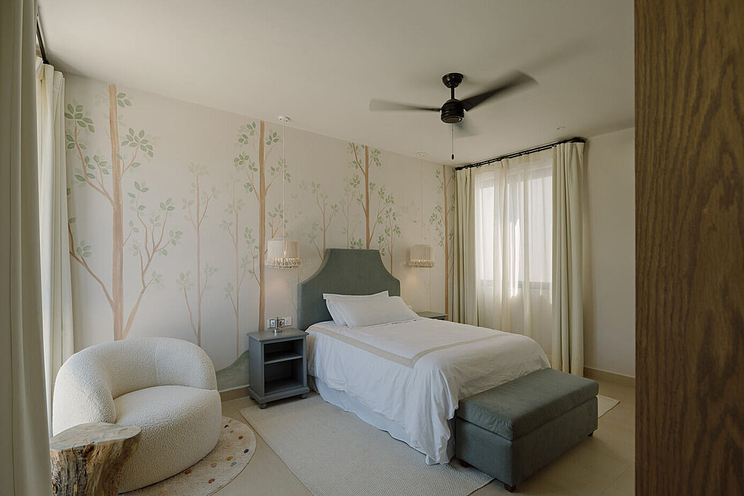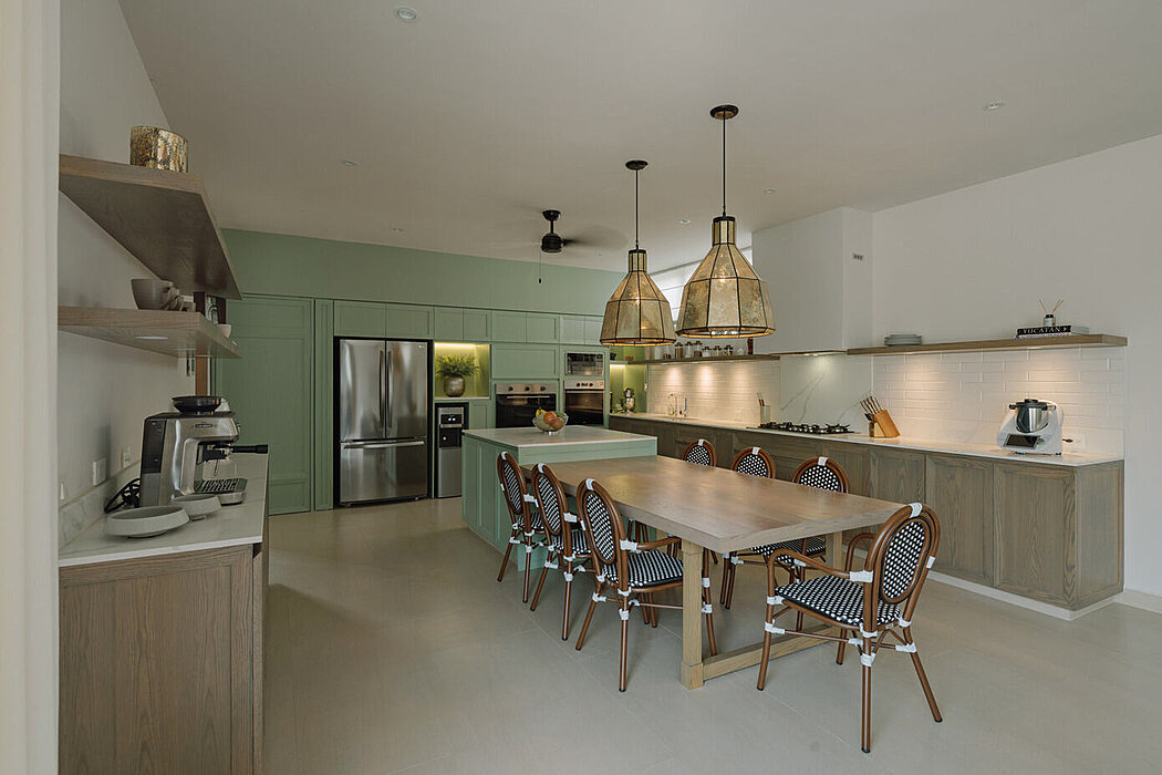 The interior design exudes serenity, fostering relaxation and well-being for the inhabitants. The color palette reflects hues found in nature, with green serving as a calming neutral. By utilizing natural finishes, soft textures, and diffused lighting, the design creates cozy spaces ideal for rest and contemplation.