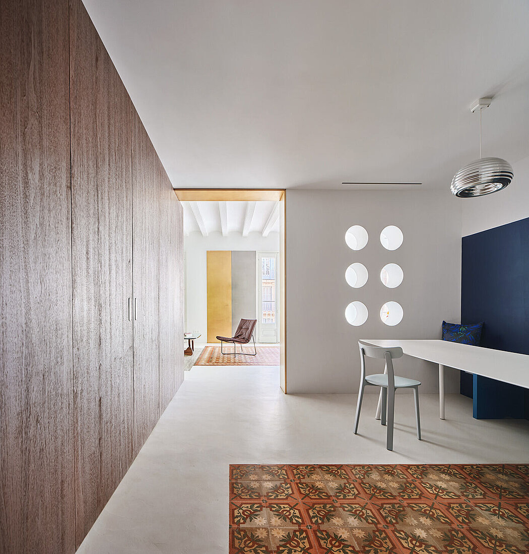 The transformation and refurbishment of this apartment followed its unique condition. A striking walnut wood front, with its open pore, runs the entire length of the apartment, a full 21 meters (69 feet). This elegant dark feature starts from the Girona-facing living room and continues to the courtyard-facing gallery.