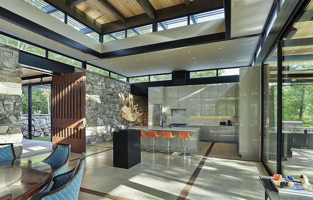Local volcanic stone and reclaimed Sinker Cypress define the façade. Their unapologetic, raw beauty captures the essence of the surroundings. Indeed, reclaimed materials echo throughout the structure. Stone, a regional hallmark of Arkansas, prominently features in multiple forms.