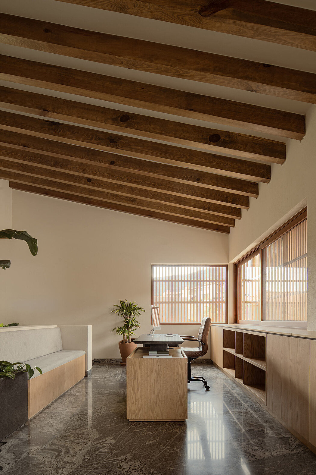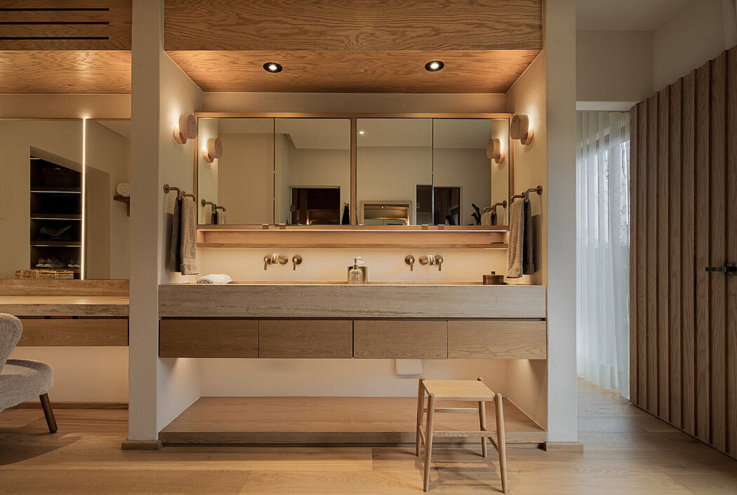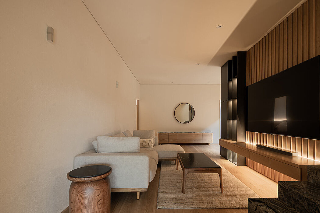 In the end, through meticulous furniture selection, the design strikes a balance. It offsets the wood’s color contrasts and seamlessly weaves timeless elements into every living corner.