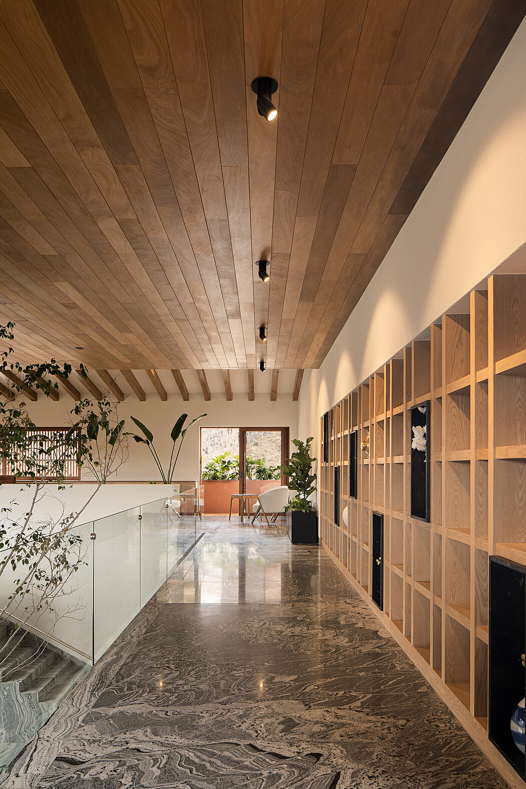 At the home’s very core lies an enclosed interior patio, crowned by a towering tree. This majestic element not only accentuates the double height but also masterfully regulates the indoor temperature and stands as a visual centerpiece. Venturing further up, the upper floor reveals an array of amenities. From a cozy study to an inviting bar, a state-of-the-art gym, and an expansive bookcase, each element harmoniously aligns with the main corridor’s flow.