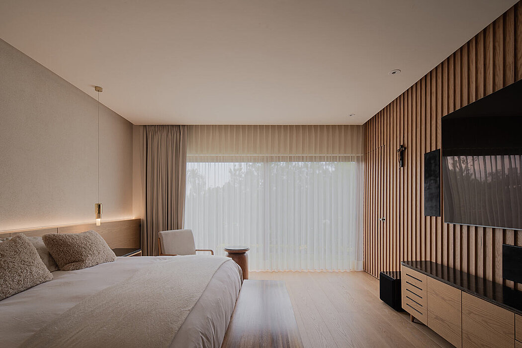 Responding harmoniously to the natural environment, the architecture skillfully adapts to the site’s undulating topography. As a result, a basement takes shape, cleverly designed with direct exterior openings due to its downhill slope. Moreover, the main access floor capitalizes on the property’s expansive space, presenting an open-plan layout adorned with impressive double heights.