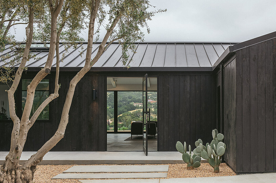 Concrete floors, extending from the interior to the exterior, along with new aluminum-and-glass sliding doors, amplify the connection to the outdoors. As Architect Dan Weber insightfully points out, “The shou sugi ban aligns perfectly with California’s native scenery, mirroring the dark green hue of oak tree canopies.” Complementing this, a contemporary standing-seam metal roof graces the house.