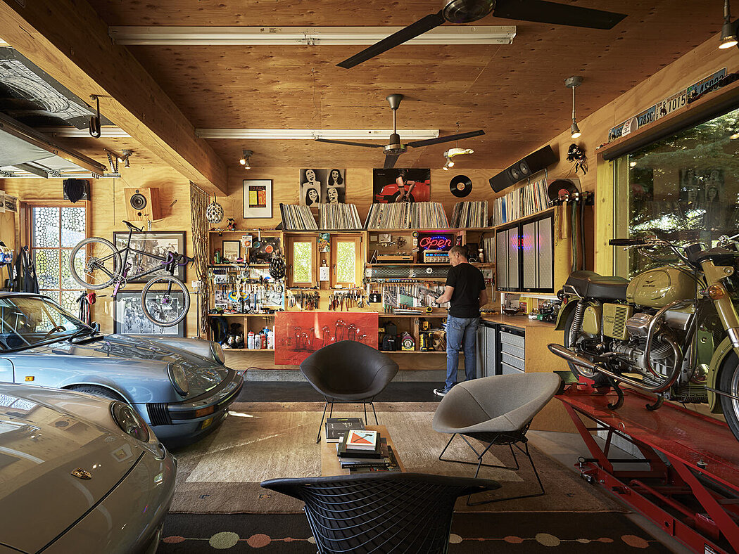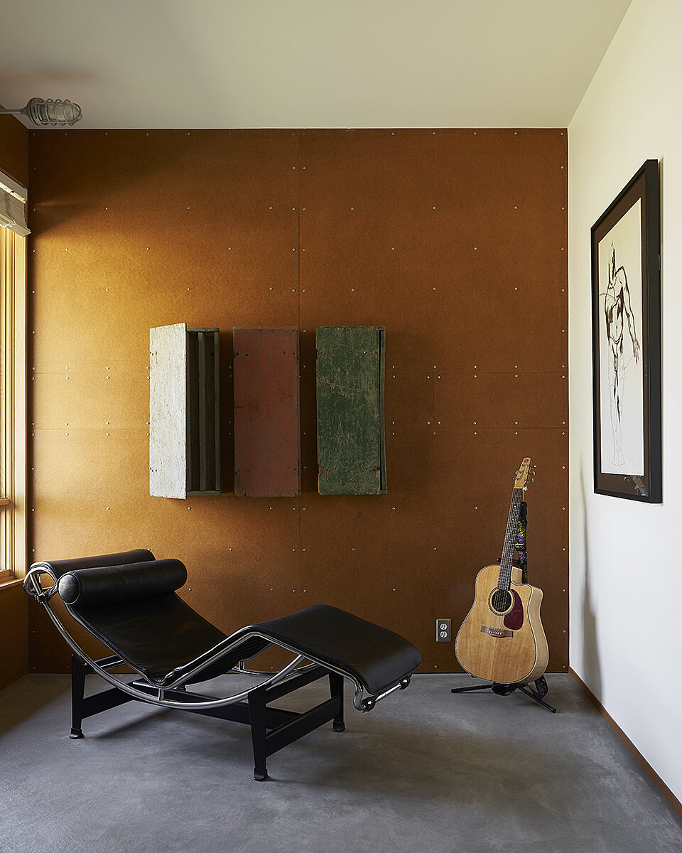 By 2001, as the family grew, they strategically added a guest house, ideal for hosting. Moreover, a roomy garage found its place on the property. This space now houses Eric’s diverse collections, ranging from cars to vinyl records. Thoughtfully, oxidized steel, chosen for the garage, mirrors the home’s aesthetic, rusting naturally over time.