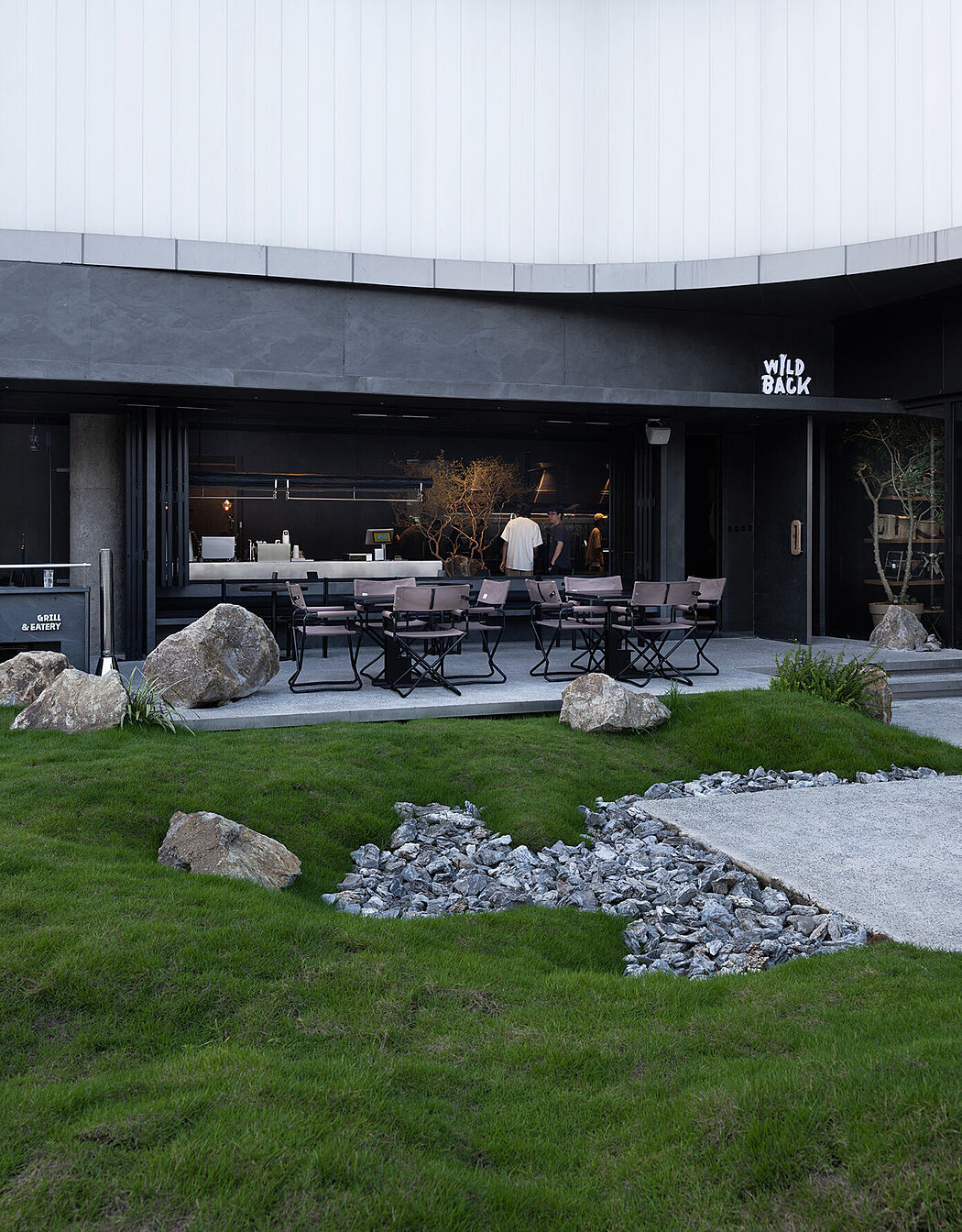 Windows that fold open help connect the inside and outside. Inside WILD BACK, there are big rocks and tree branches that make the place feel lively and close to nature.