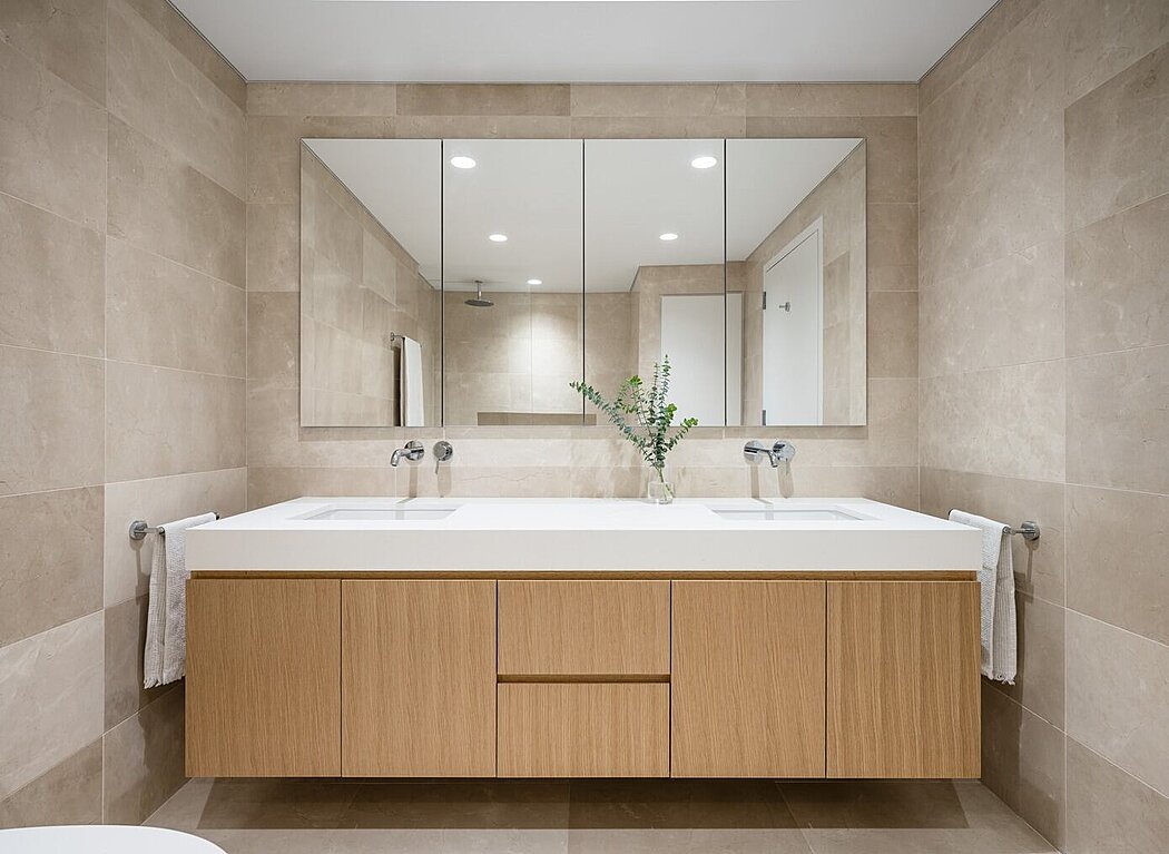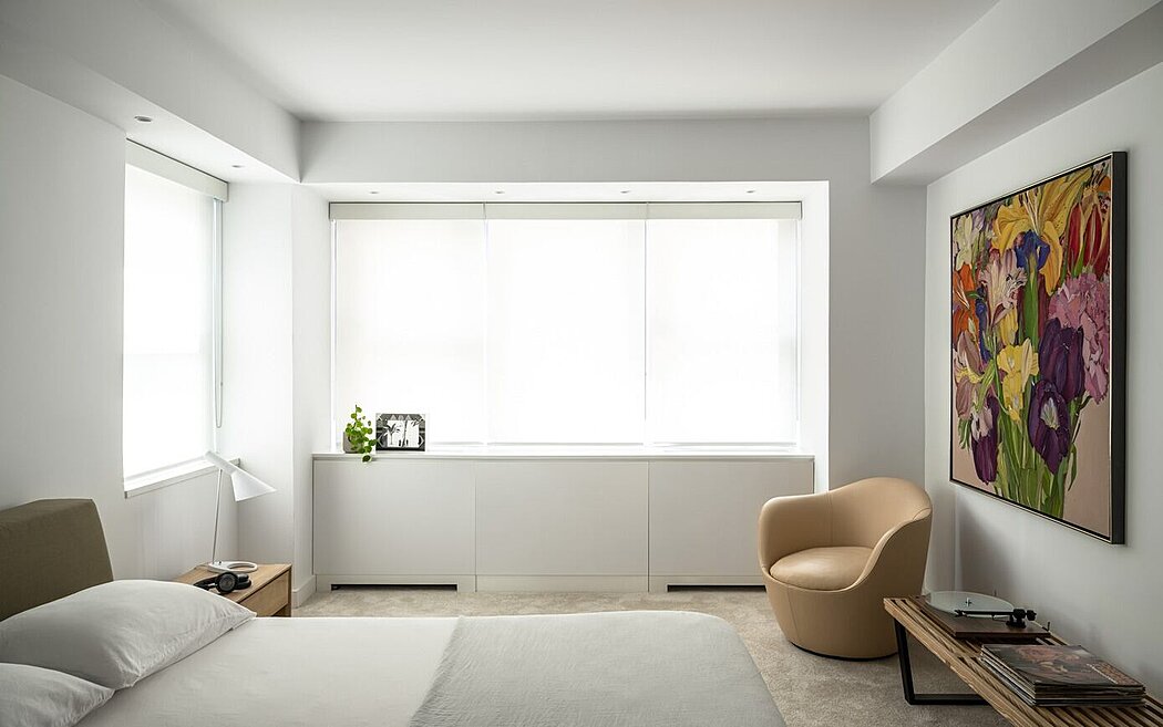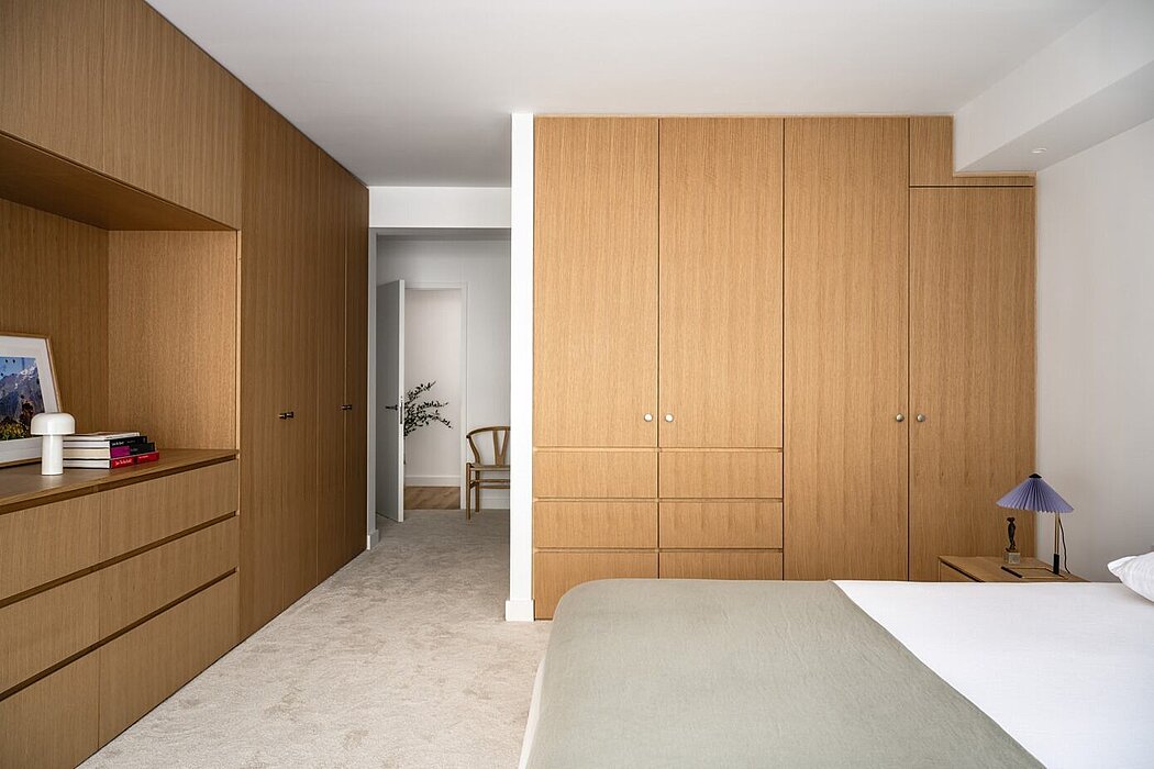 Central to the apartment, the kitchen’s redesign removed barriers, introducing a peninsula that extends into the dining area. This not only expands the usable space but also ensures a more cohesive environment. Furthermore, the open-plan kitchen enhances the penetration of natural light deep into the apartment’s core and eases the transition from communal to private spaces. The cabinetry, crafted from white oak, and the countertops, sculpted from white engineered stone, accentuate this bright, open aesthetic.