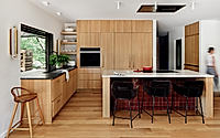 The original floors and study woodwork were preserved, while the foyer features dramatic black lacquer doors and railings. Each room is versatile, from the formal living room with desks to the kitchen doubling as a family room. This thoughtful design caters to the needs of a modern family, making every space count for Veida, her husband, and their three children.