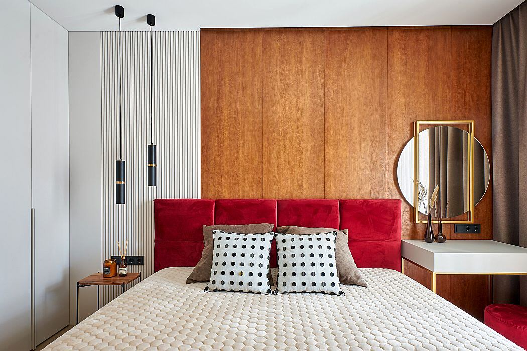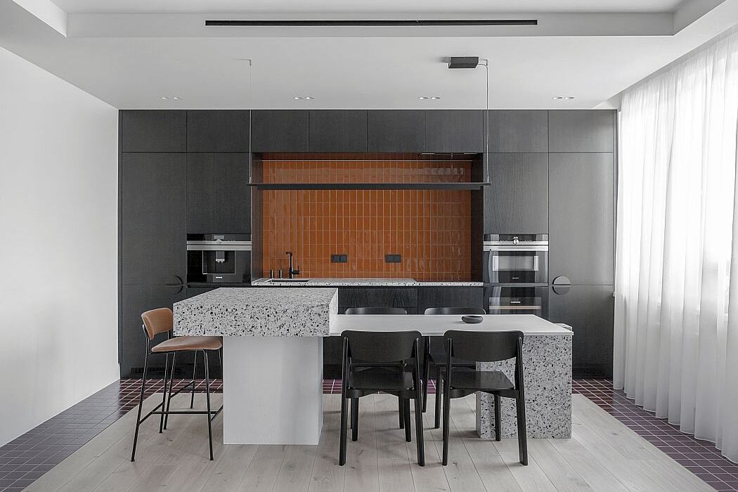 This unique project was created for a young family with a child and boasts a ceiling height of more than 3 meters (9.8 ft). The interior features natural, hard-wearing materials in pastel colors – beige, light olive, pale terracotta – and complemented by wooden soffits, a custom-made dining table, black dining chairs and a large modular sofa. This cozy and stylish real estate also has some interesting design tricks, such as slots in the furniture in the children’s room and a niche for the shower curtain in the bathroom.
