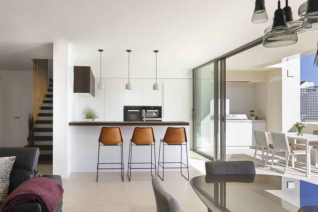 Spanish studio ARK Architects has completed a minimalist residence encased in staircases to preserve ancient trees on the plot in Benahavís, Spain. Named Villa Kaizen, the home fits snugly between several leafy trees. The name “kaizen” translates from Japanese to mean “improvement” and refers to the home’s strict minimalism, which nods to archetypal Andalusian villas.