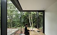 The Gu House is a house located in West Vancouver, Canada, designed in 2020 by splyce design. The residence follows a facade of contrasting black stained cedar cladding and white fiber cement panels. Formed in a faceted “C” shape, it creates an interior courtyard for the family while shielding them from noise and views from a nearby highway. The sheltering facade opens to the interior with one large, double height window in the vaulted kitchen space.